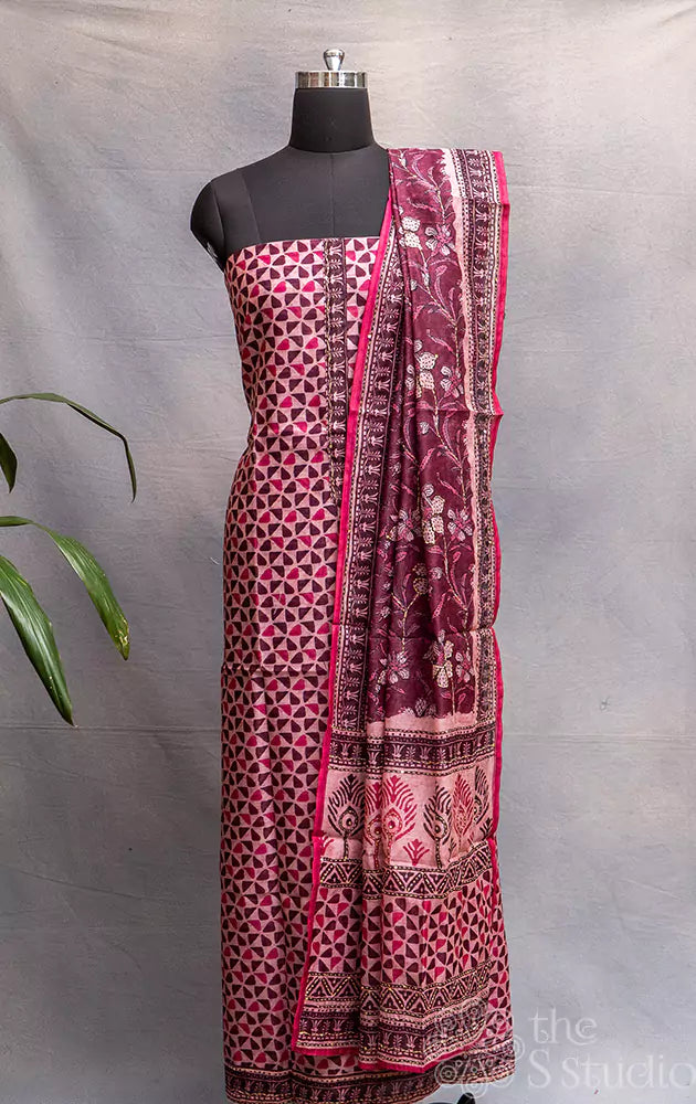 Dark pink semi silk salwar suit with floral prints and embroidery
