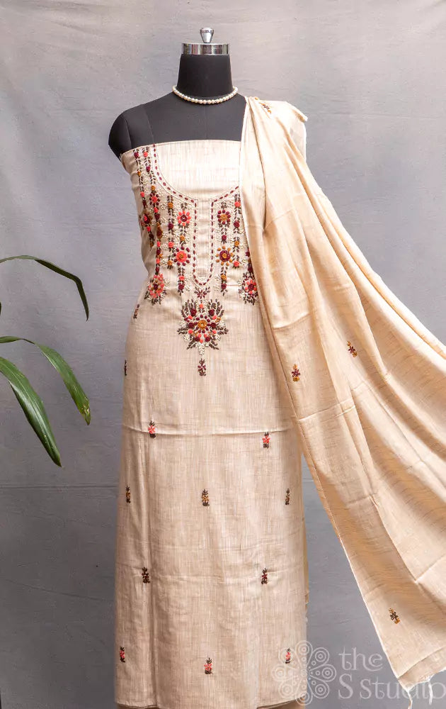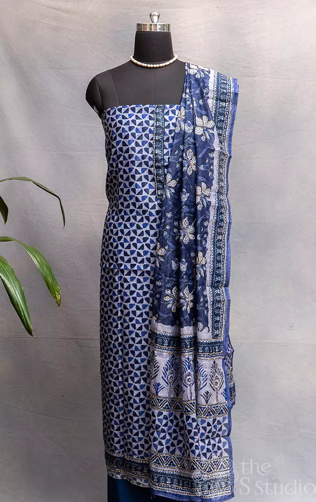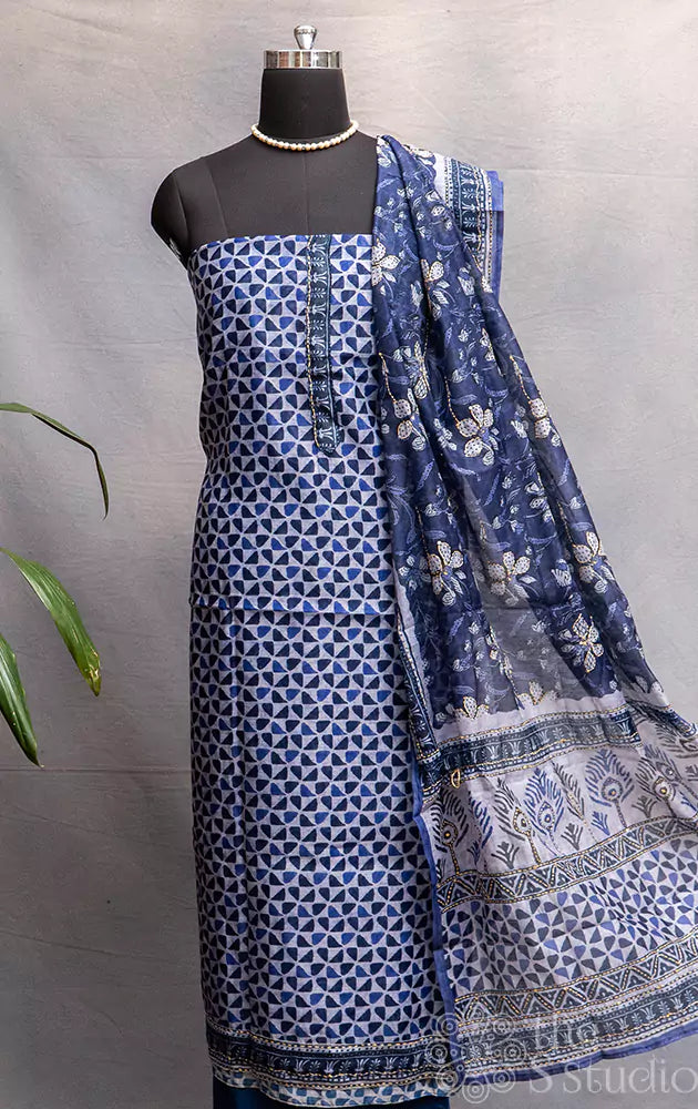 Off white with Blue cotton salwar set with floral embroidered top and dupatta