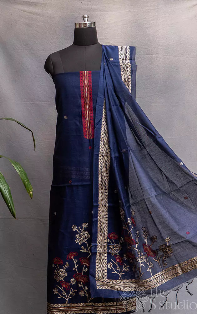 Teal blue chanderi cotton salwar set with kantha embroidery