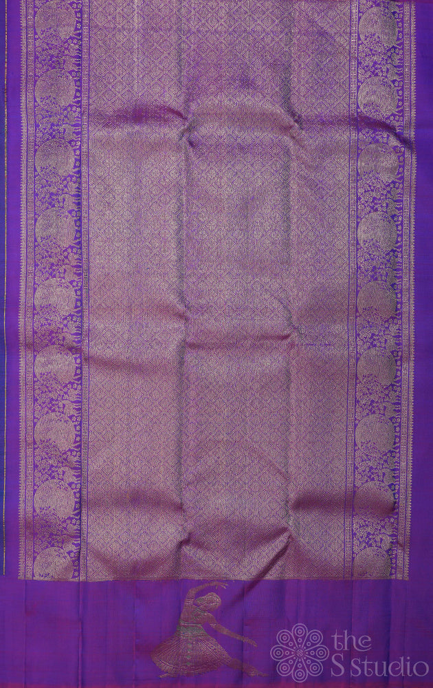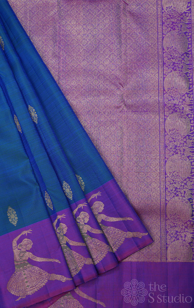 Anadha blue kanchi silk saree with allover small peacock bhuttas and a purple dancing lady border. The pallu is woven with zari motifs