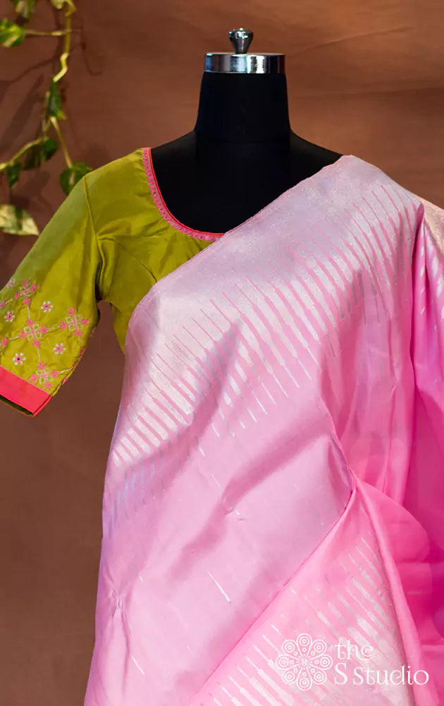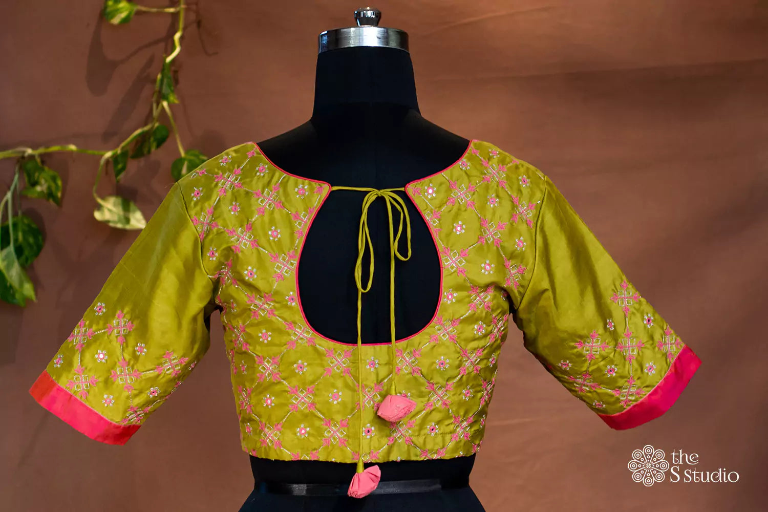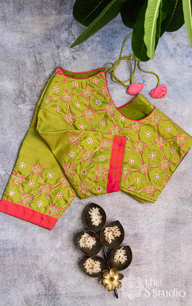 Apple green pure kanchi silk blouse with bubble gum pink hand embroidery detailing allover back and sleeves.