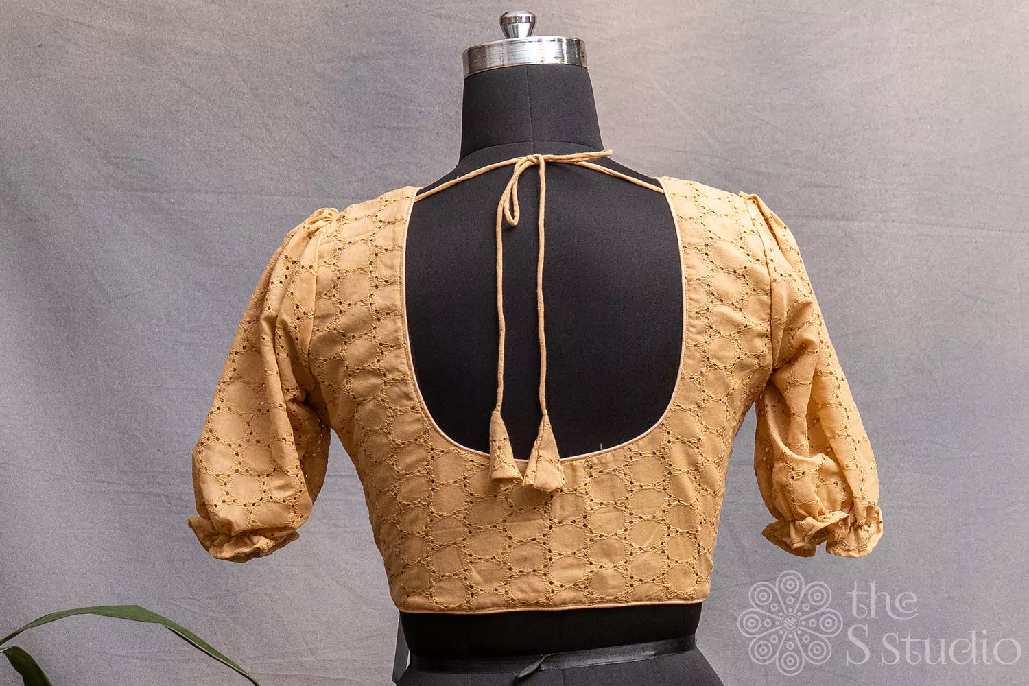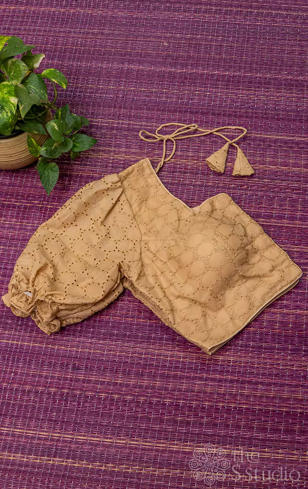 Beige hakoba cotton readymade blouse. Includes: Puff sleeves, tie back, and front open.