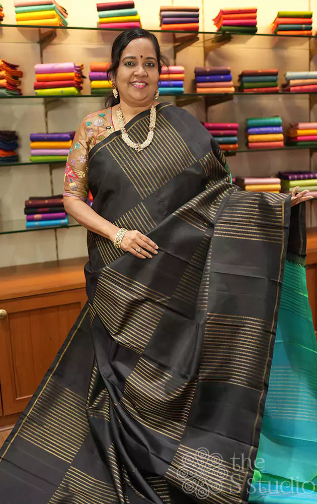 Black kanchipuram silk saree with vertical zari lines in a box pattern on the body. The pallu is a sea green in same zari pattern and the sea green blouse adds to the elegance.