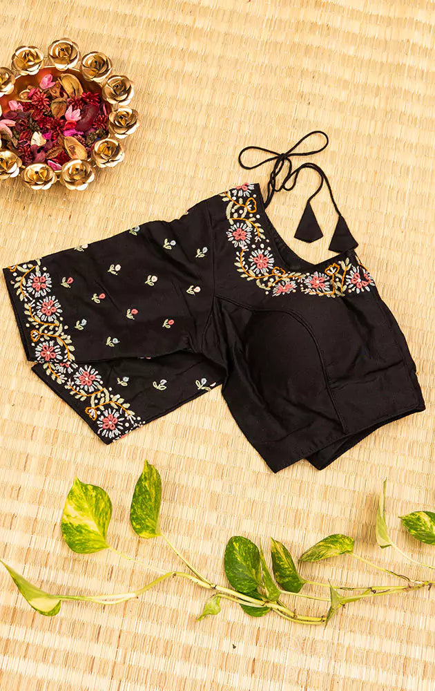 Black hand embroidered raw silk blouse with beautiful neck pattern highlighted by multi colour embroidery Includes: normal sleeves, tie back and front open