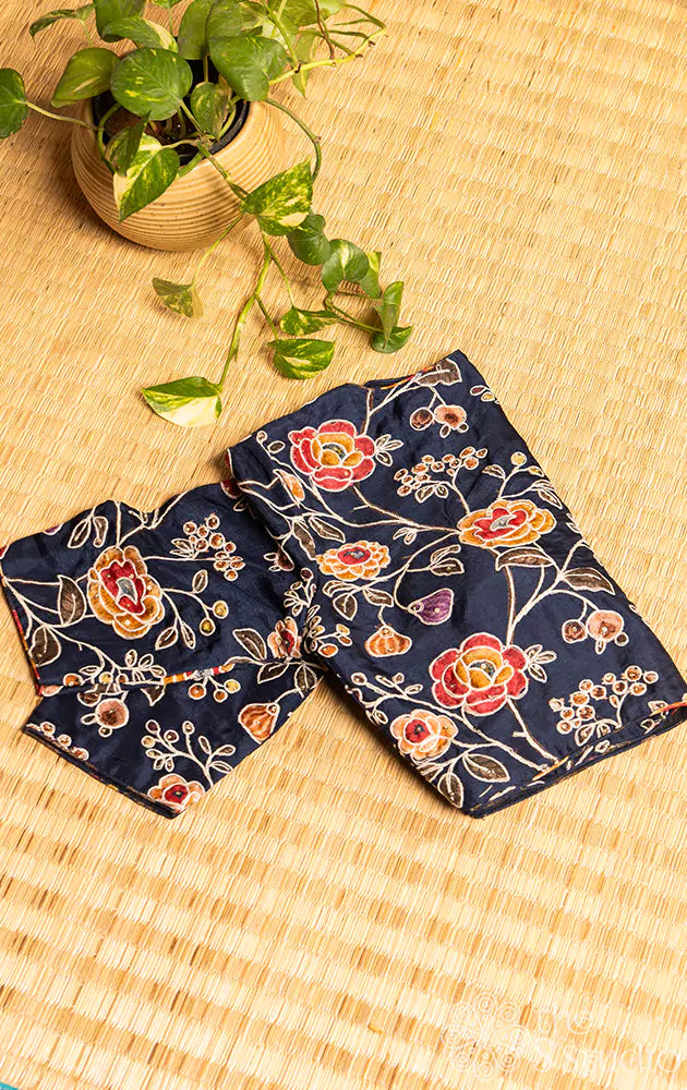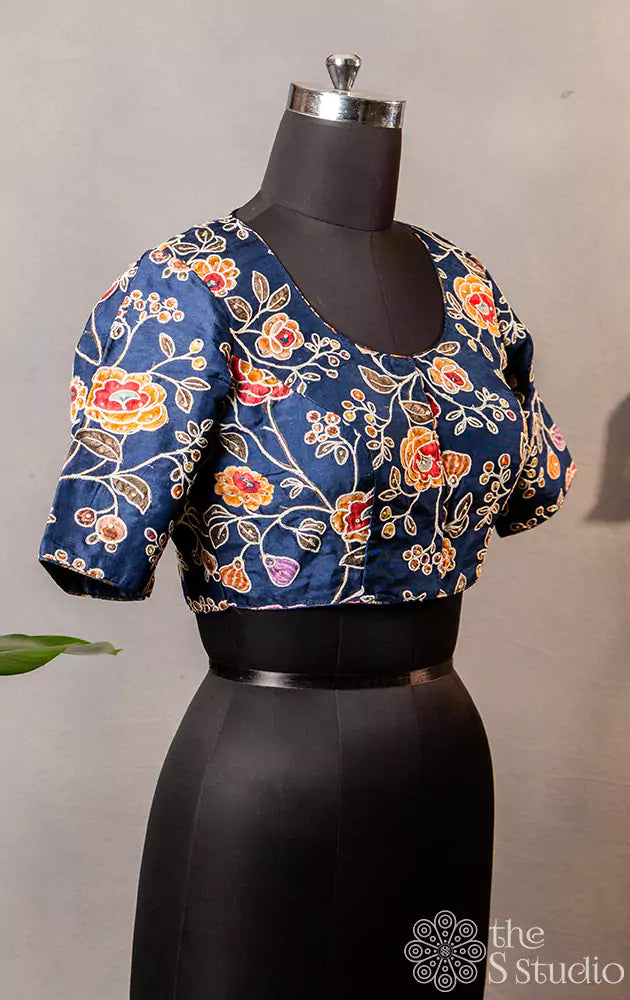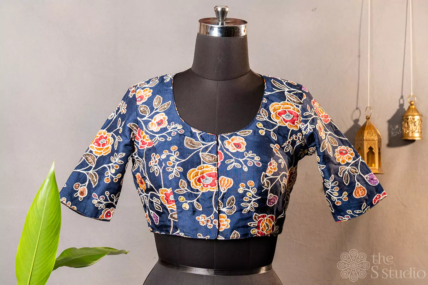 Blue floral printed semi silk readymade blouse with hand embroidery