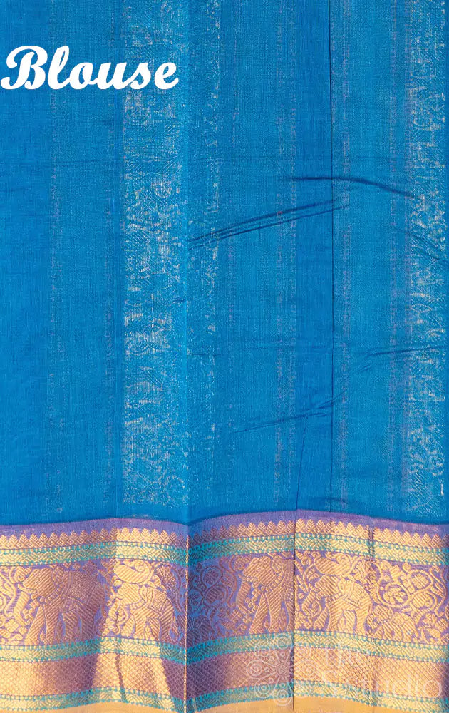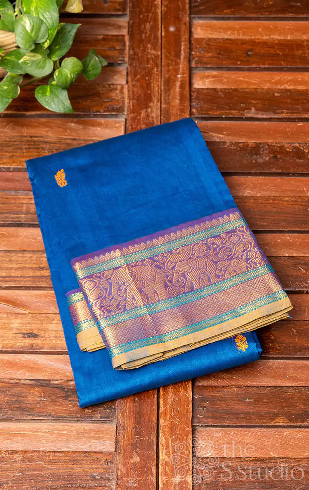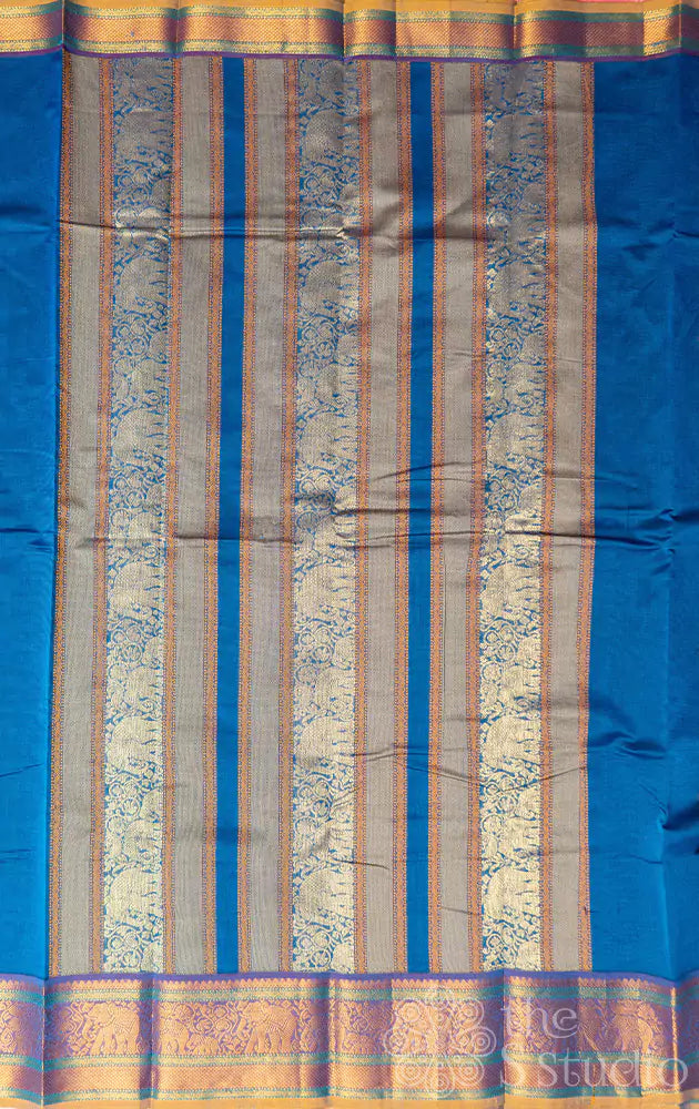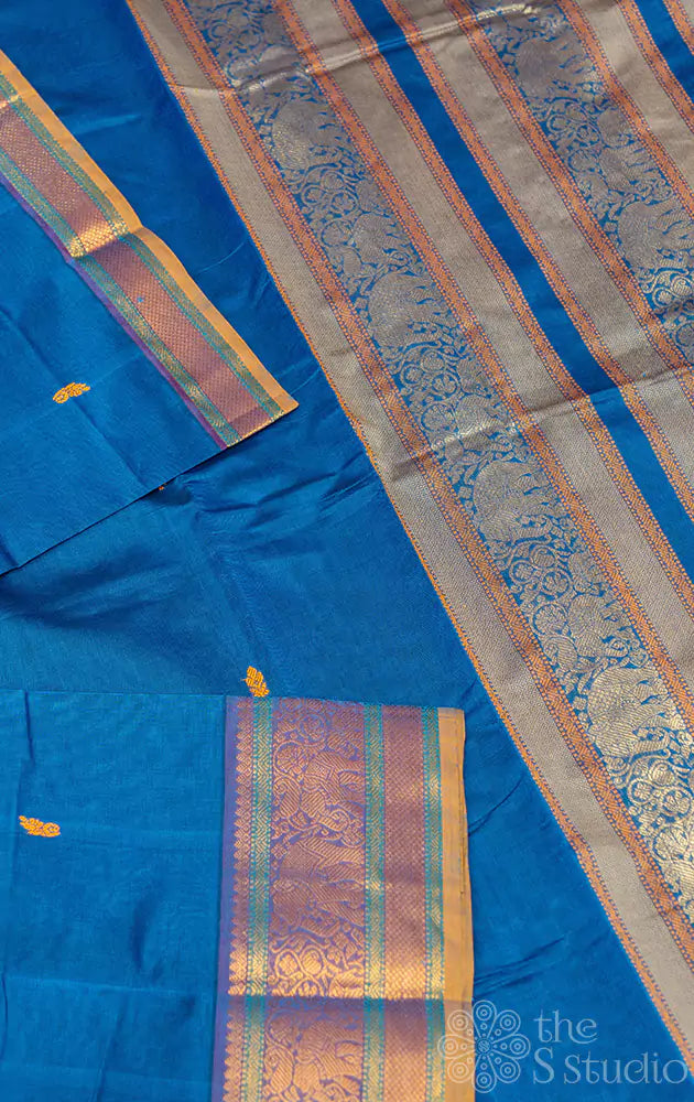 Blue handwoven kanchi cotton saree with zari border and grand pallu