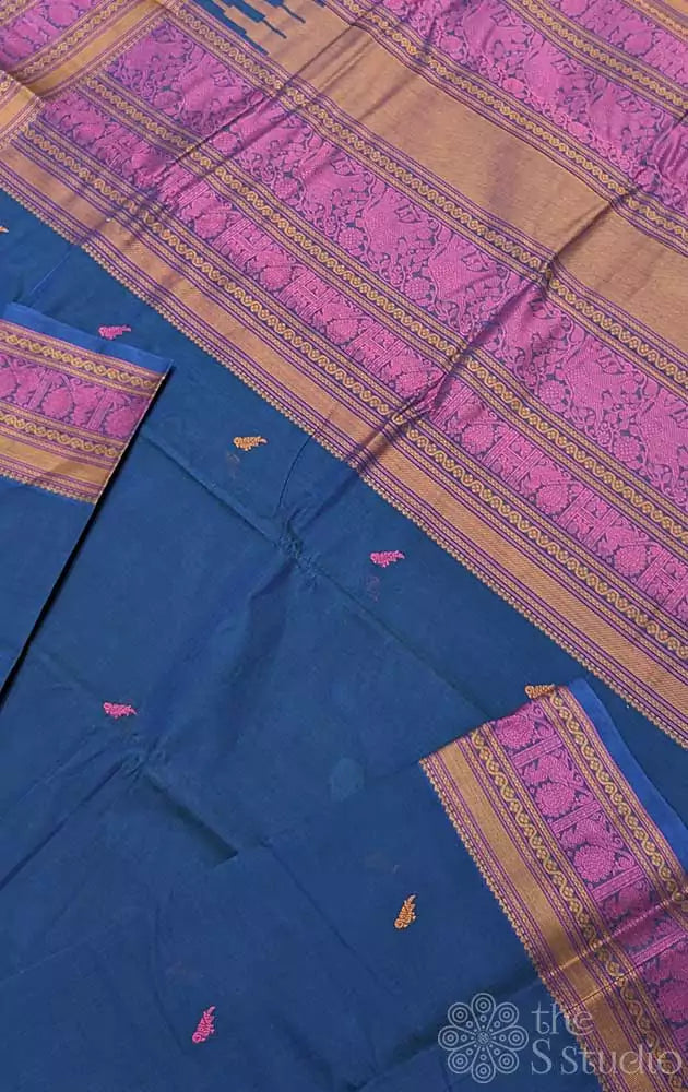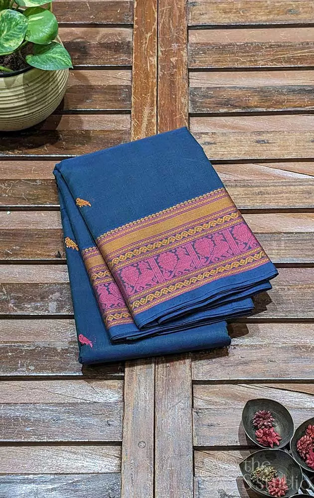Blue kanchi cotton saree with threadwork handloom saree with peacock motifs on the border. The body of the saree is adorned with small parrot motifs.