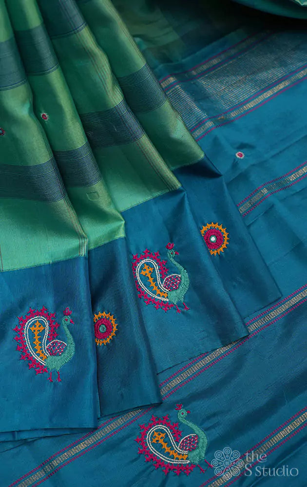 Bluish green checked kanchi silk saree with kutch hand embroidery from the kutch region of Gujarat. A fusion of crafts.