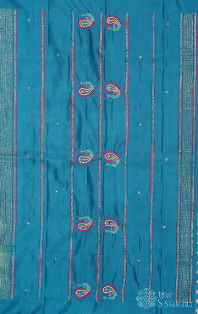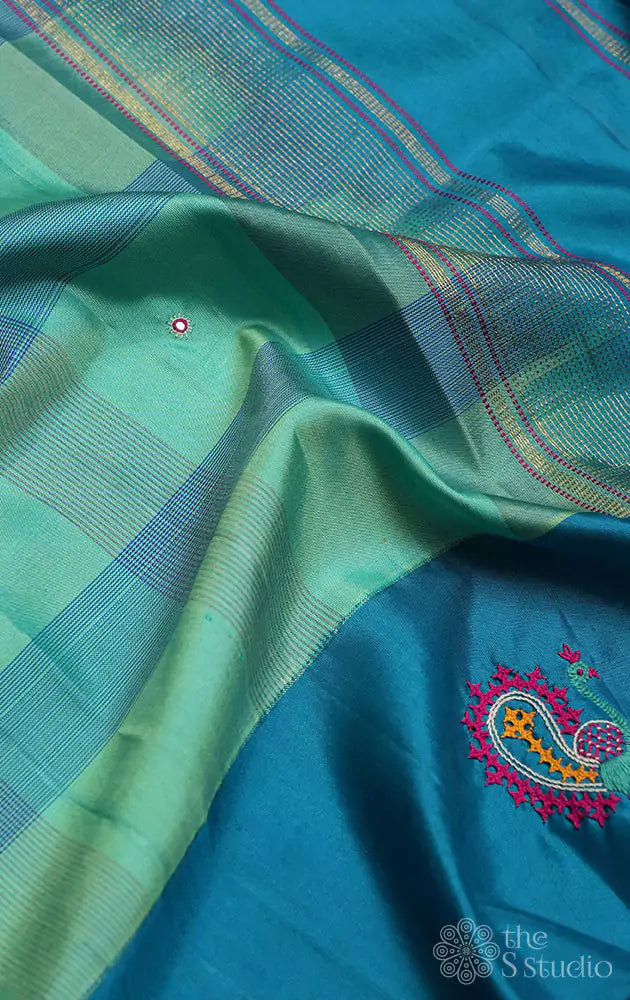 Bluish green checked kanchi silk saree with kutch hand embroidery