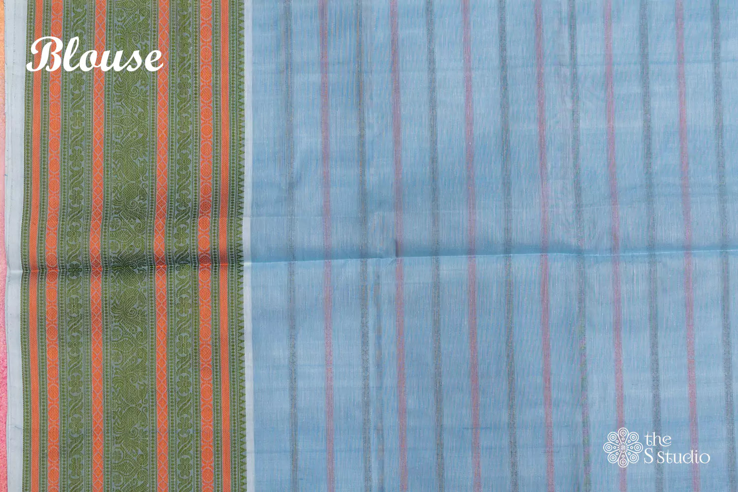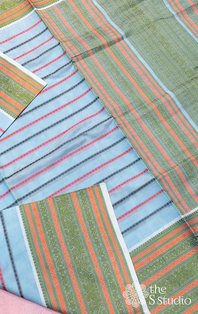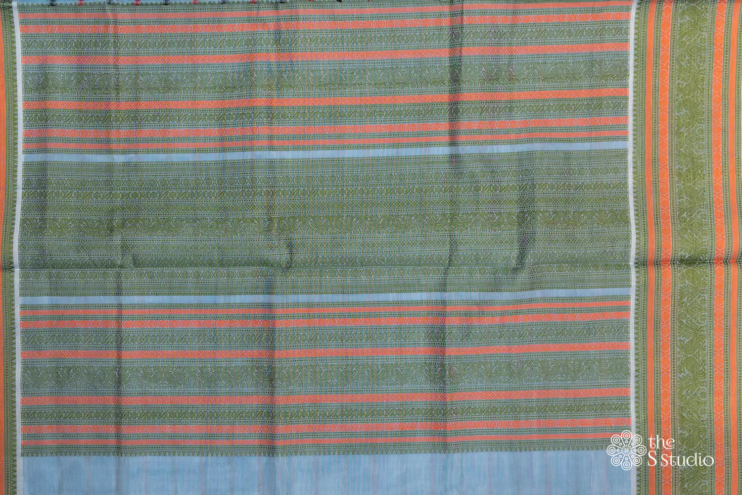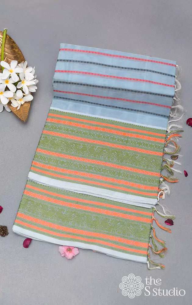 Stunning Blueish Grey Veldhari Silk Cotton Saree with complete thread work is a delight to style. The body and pallu is enhanced with interesting thread woven designs.