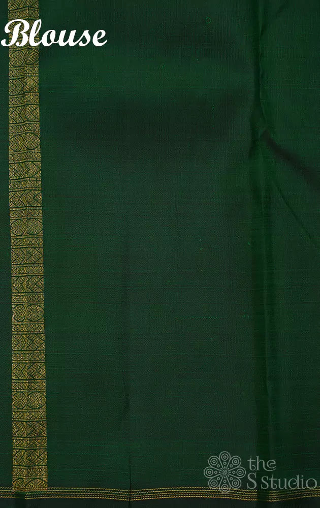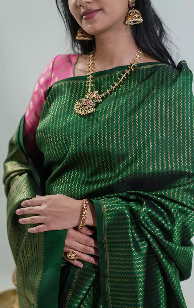 Bottle green and rani pink half and half kanchipuram silk saree with the bottle green shoulder portion having zig zag zari lines and an extravagant pallu. The rani pink portion for pleats is woven with kolam zari motifs which makes for a great combination. An unique kanchi silk saree when you look for tradition matched with innovation.