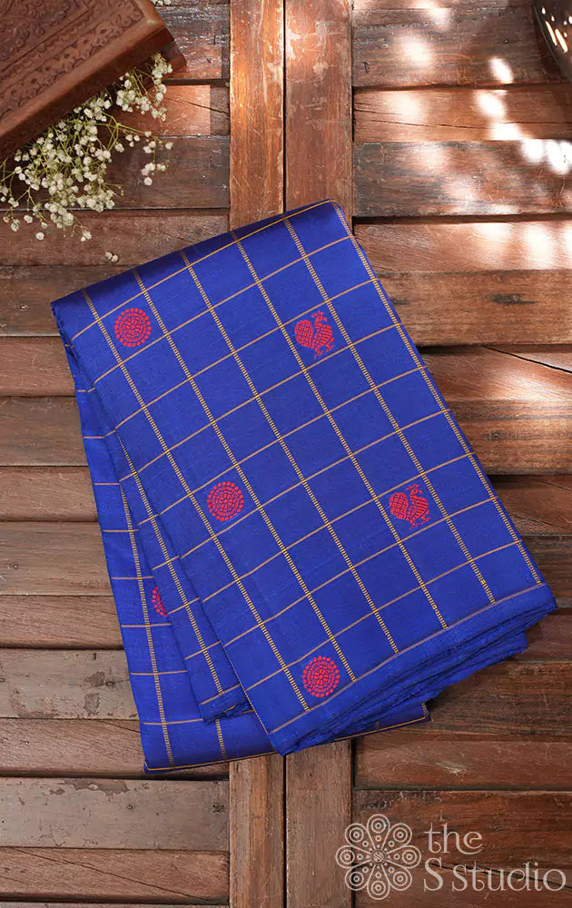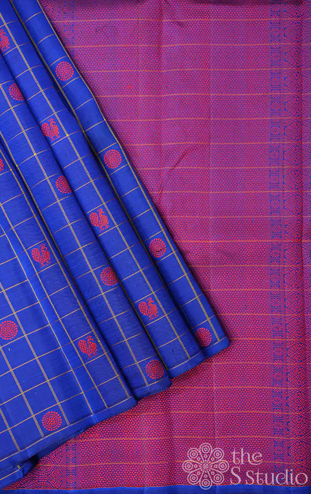 Bright blue checked kanchi silk saree with magenta thread woven buttas