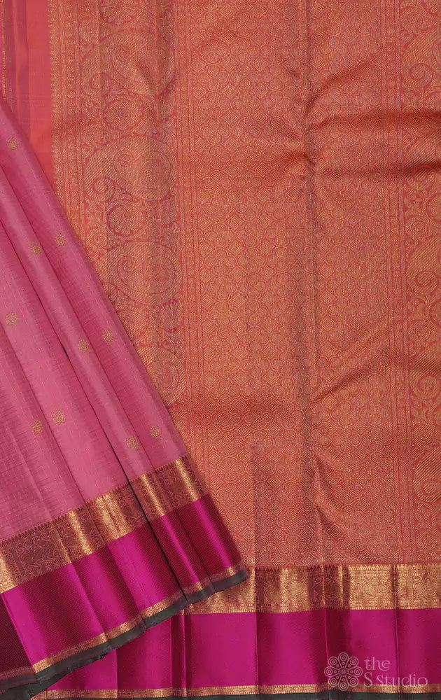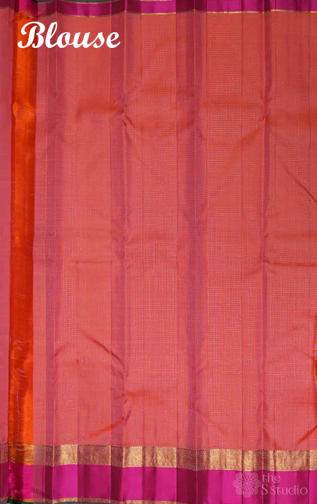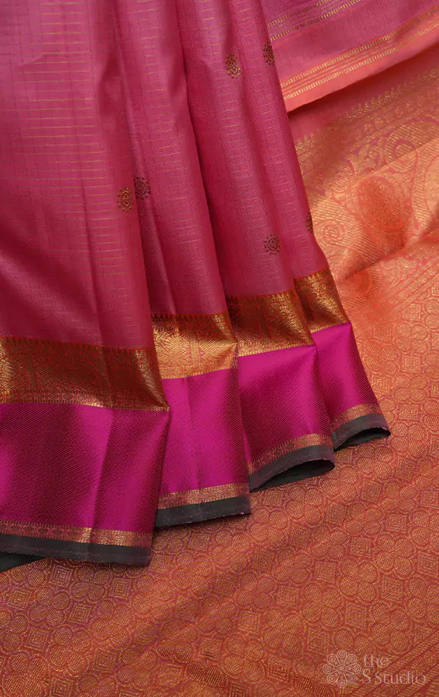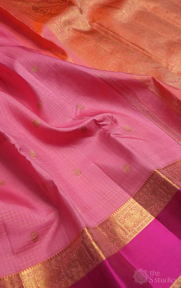 Traditional Kanjivaram Saree in bright pink hue. The rani pink zari border and regal pallu featuring stunning motifs adds grace to this festive drape.