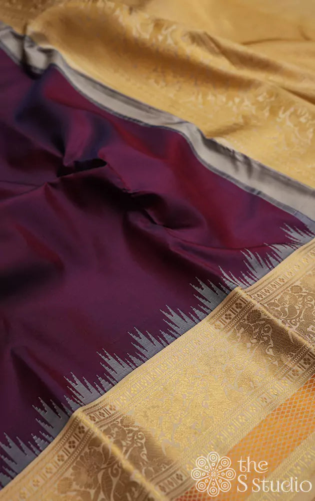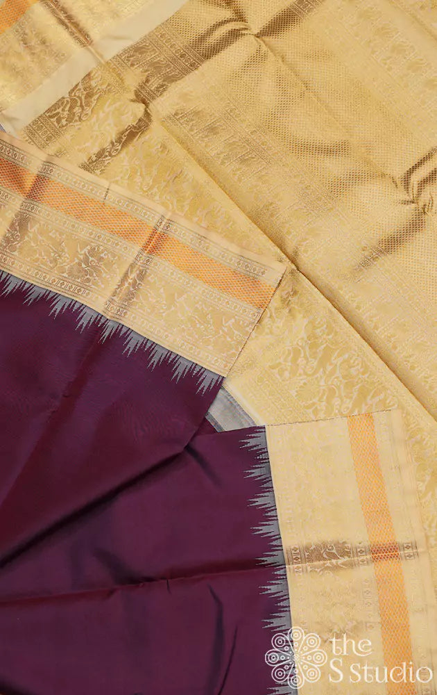 Brown kanchi silk saree with korvai Off white border and vanasingaram motifs and temple weaving on the border