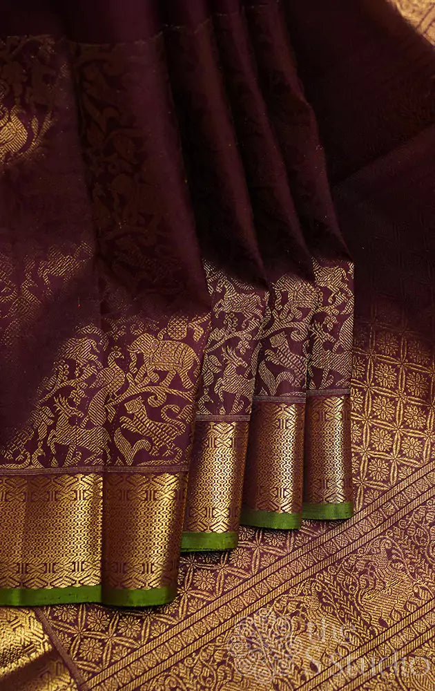This regal paaku or deep brown colour kanchi silk saree spells class with vanasingharam zari motifs along the exquisite banarasi style zari border. The thin green selvedge which adds charm to the saree is complimented by the green blouse woven with zari buttas.