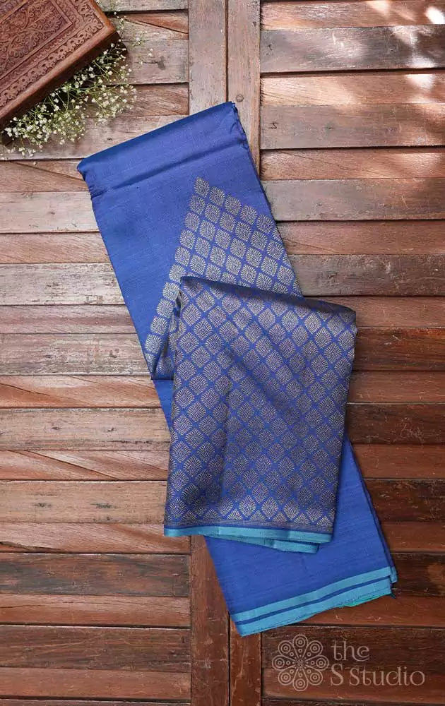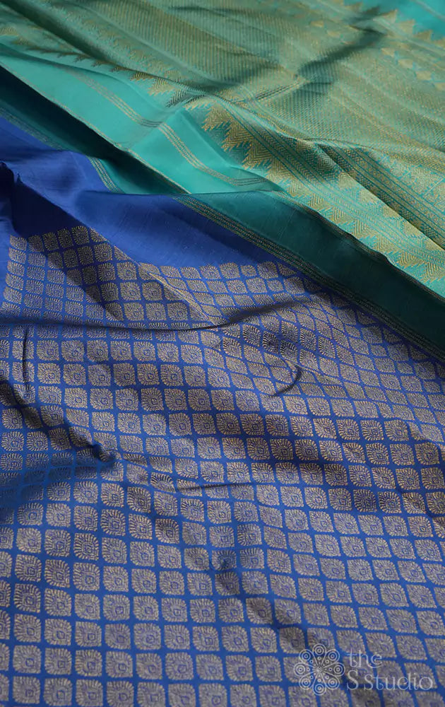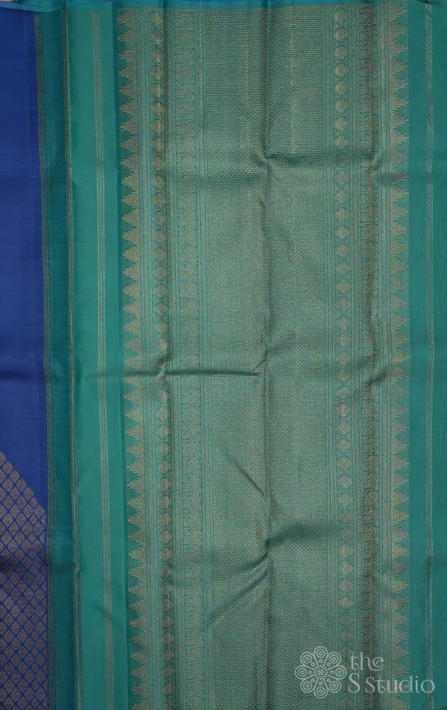 Cerulean blue kanchi silk saree with woven zari motifs along the lower half giving a border look and a contrast aqua blue pallu