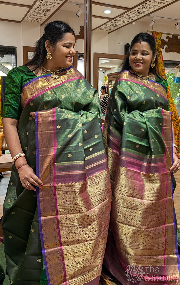 Emerald green vaira oosi kanchi silk saree with rani pink border