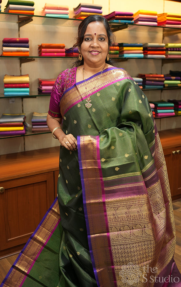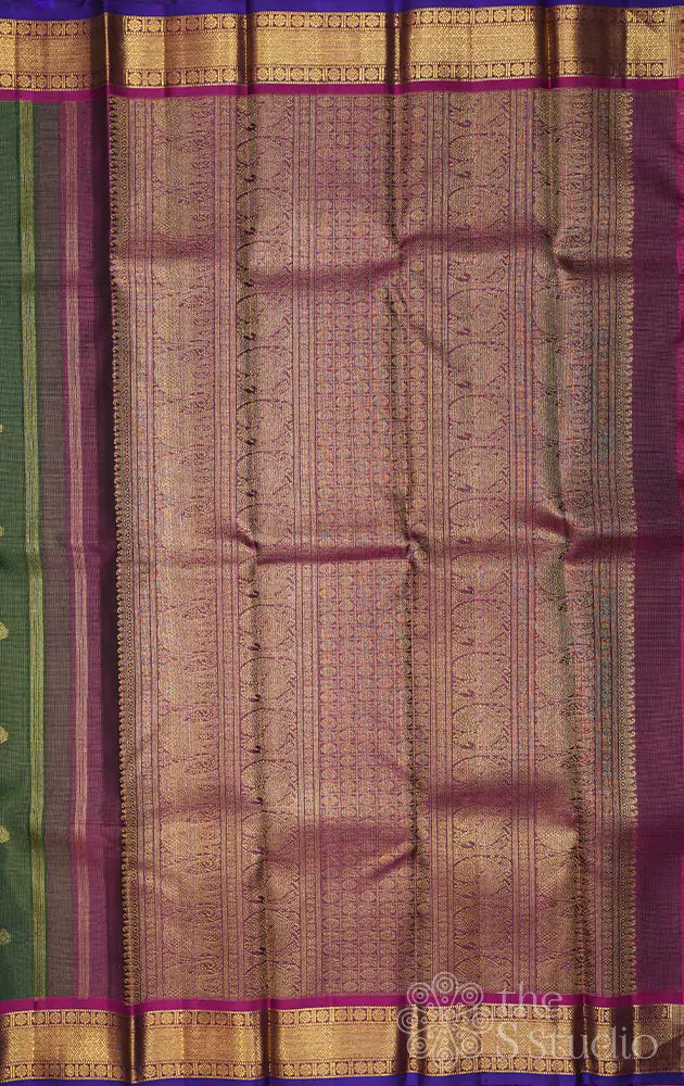 An emerald green colour vaira oosi kanchipuram silk saree with floral bhuttas woven along with vairaoosi zari lines on the body is an apt choice for any special occasion. The border is in a magenta colour with a violet selvedge woven with kamalam buttas and vanki pet in vertical fashion. The magenta pallu has mayil chakaram motifs complimented by peacocks woven in pure zari.