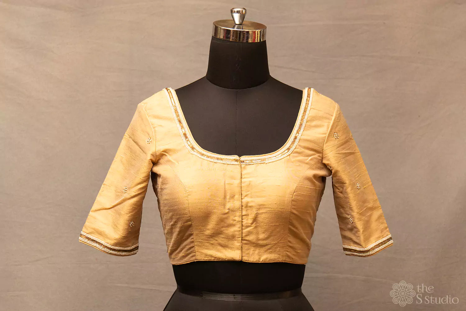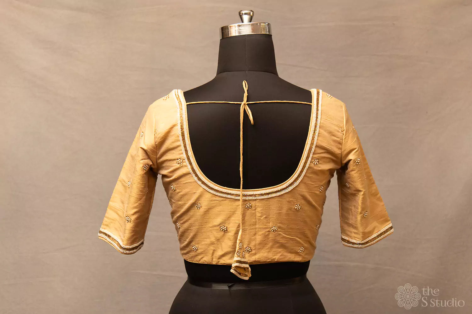 Golden beige hand embroidered pure silk blouse with beautiful back neck pattern highlighted by gold and pearl embroidery Includes: normal sleeves, tie back and front open