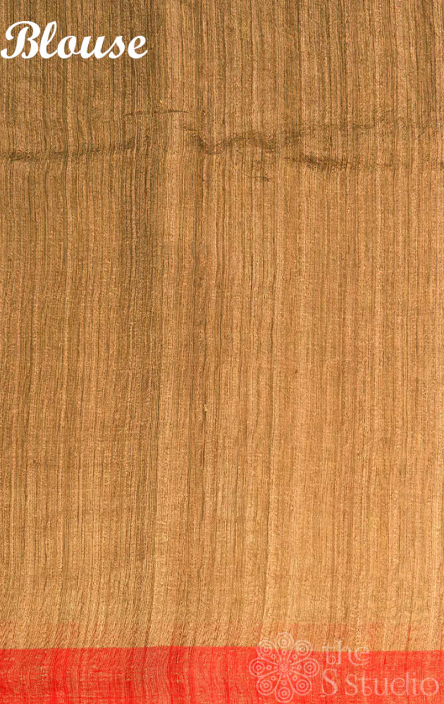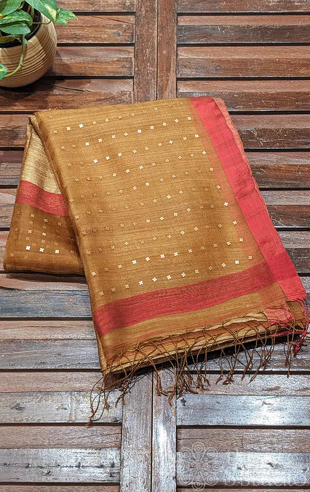 Golden brown matka silk saree featuring a red small border. The pallu of the saree is crafted from muslin silk and handwoven with sequin work.
