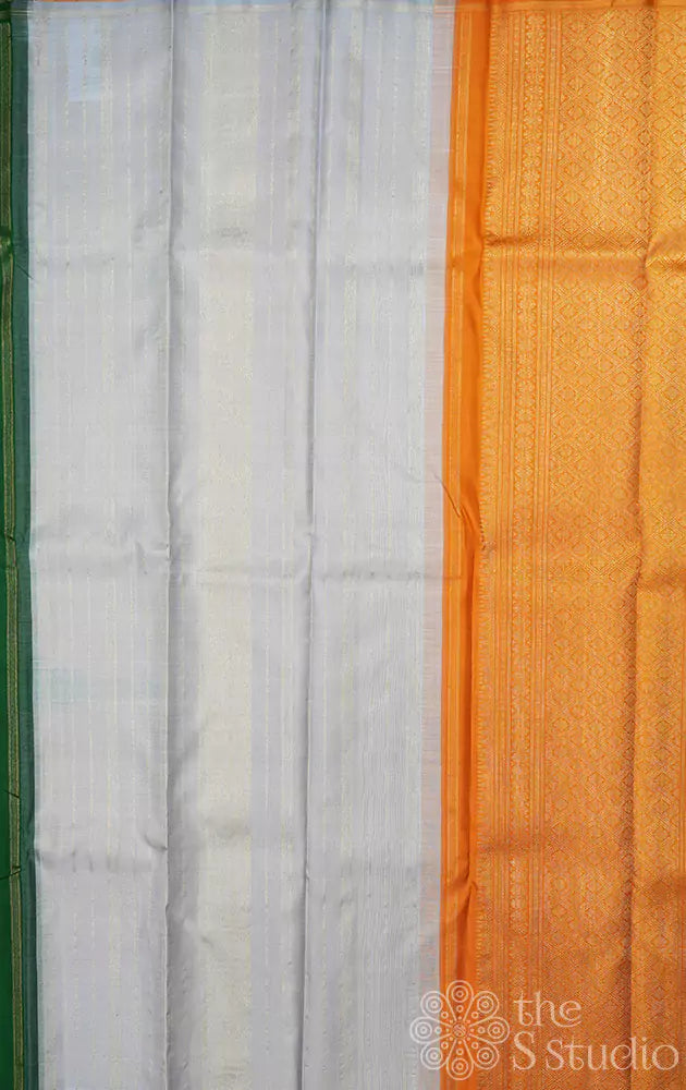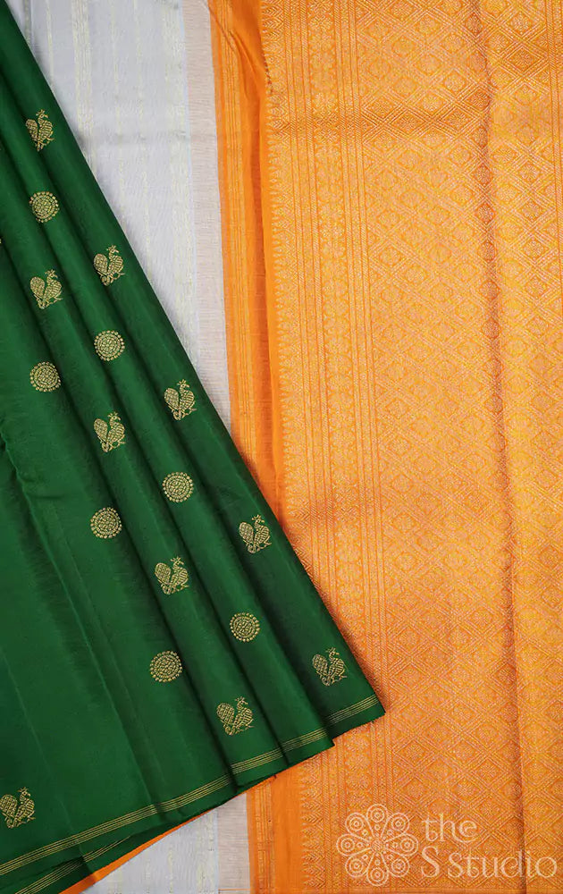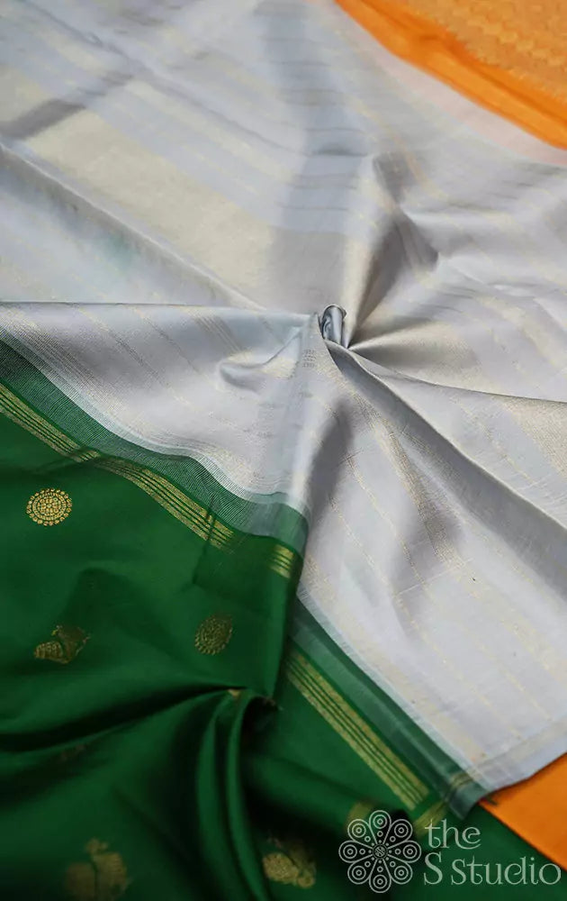 Green borderless kanchi silk saree with annam chakaram buttas woven all over in zari. A double pallu in classic mustard and grey creates a beautiful contrast to the saree. A trendy kanchi silk for a person who looks for the most unique kanchi silks.