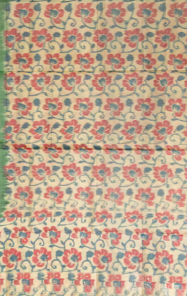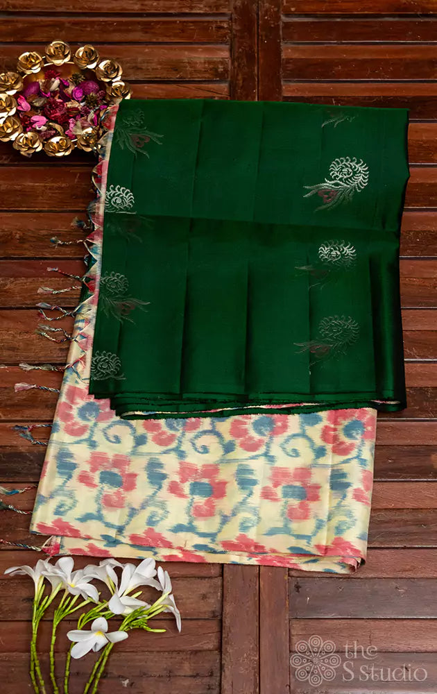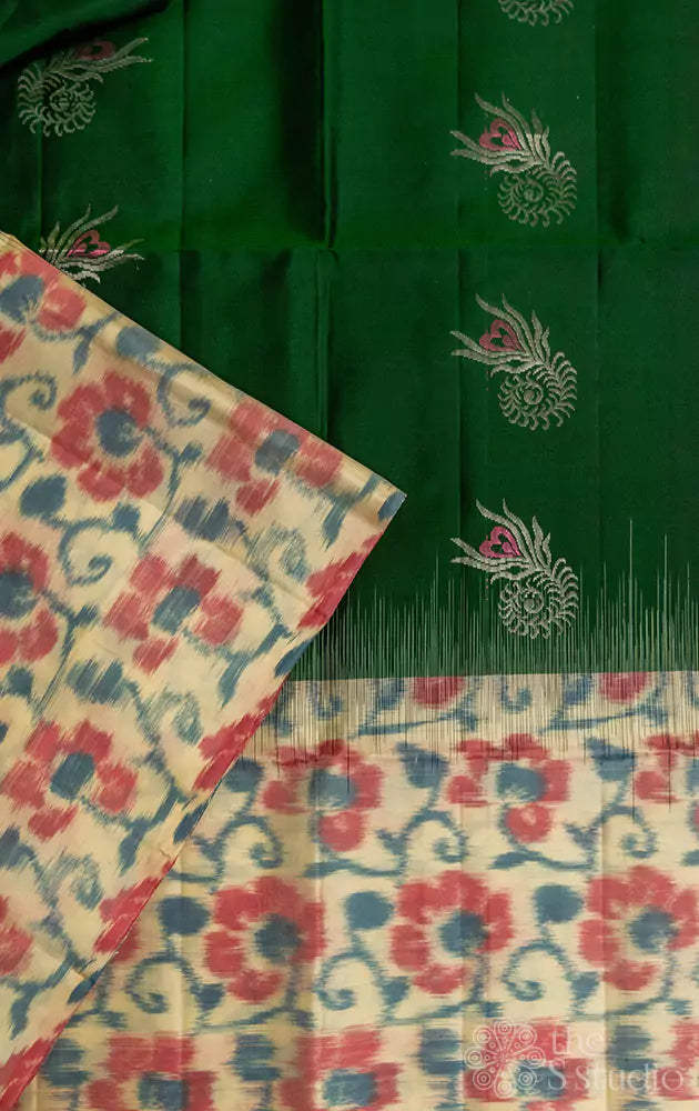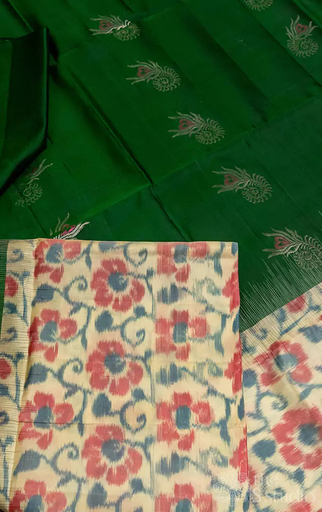 Green butta woven soft silk saree with long ikkat border and pallu woven in ikat motifs.