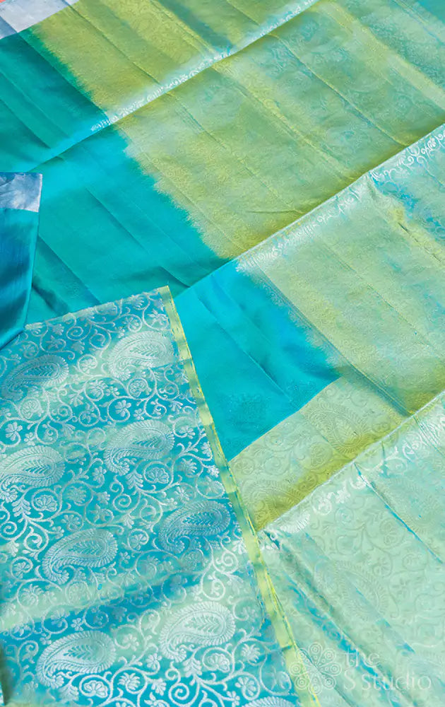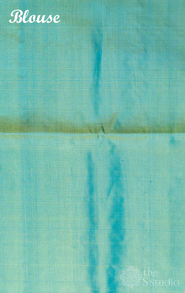 Bluish green soft silk saree with a long pale green border woven with paisley zari motifs