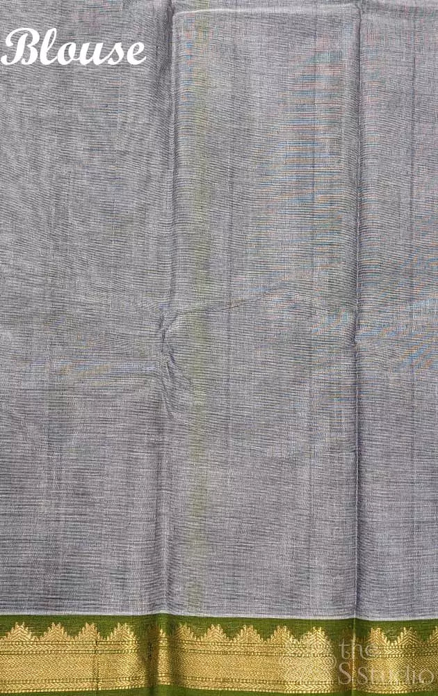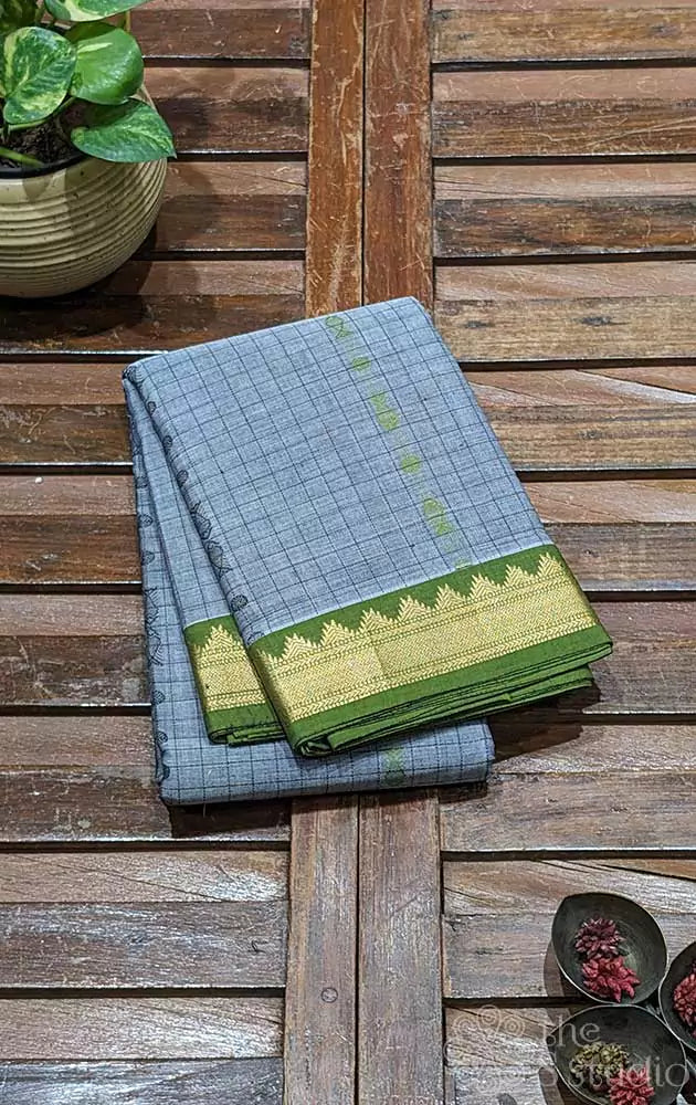 Grey checked kanchi cotton handloom saree with fishpet designs. Saree is highlighted with the green small border.