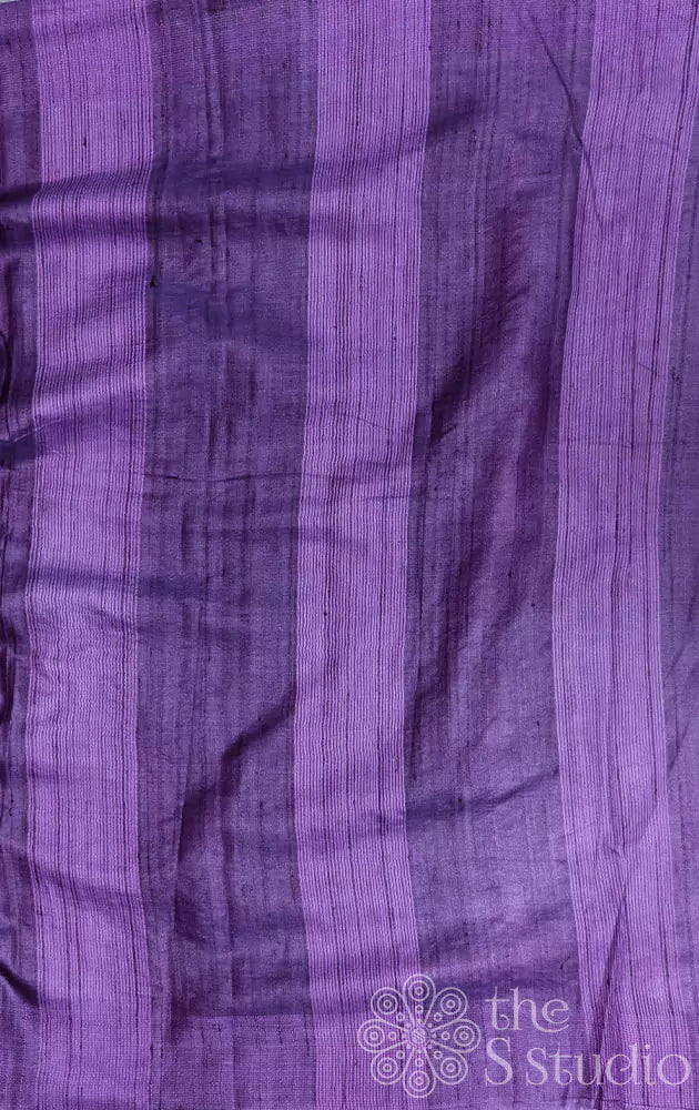 This beautiful tussar silk saree features violet floral printed designs, while the pallu showcases alternating lavender and violet patterns.