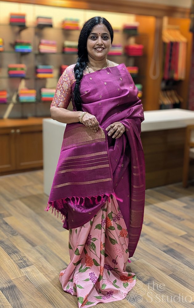 This pink and magenta half and half reversible digital printed Kanchi silk saree can be worn both ways, offering two distinct styling options