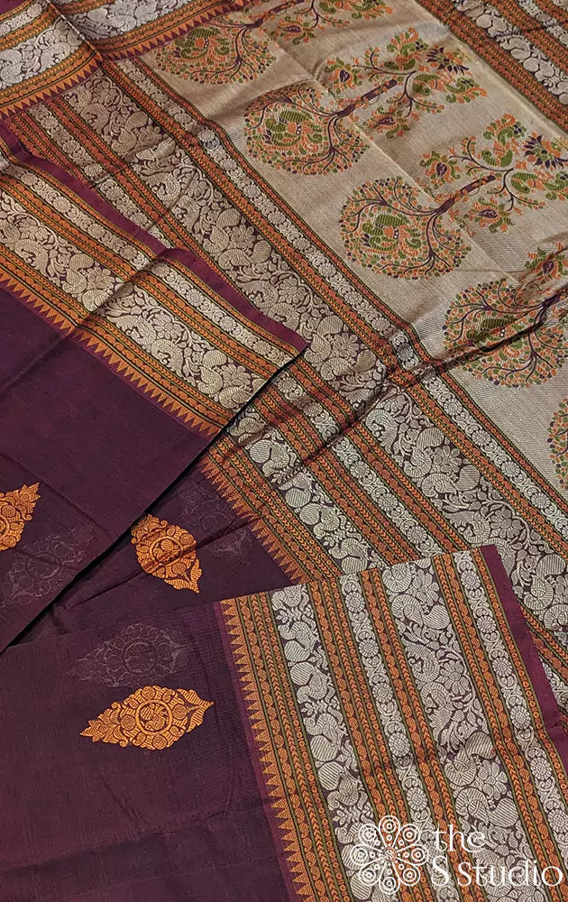 Dark purple handloom threadwoven kanchi cotton saree with long border