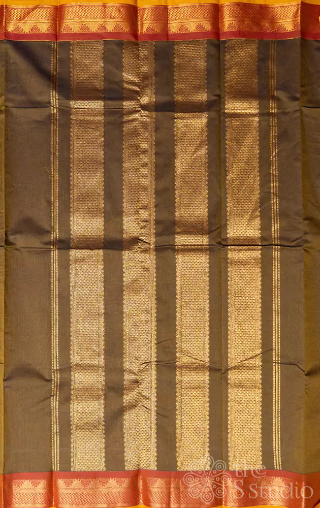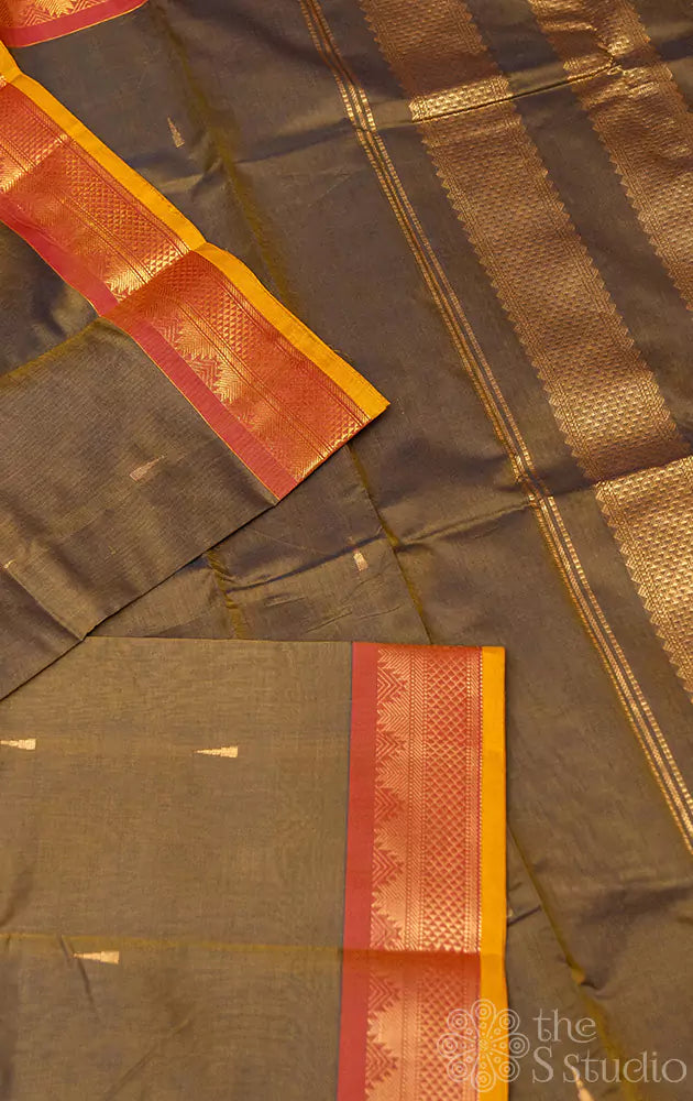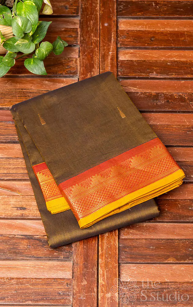 Methi green handloom kanchi cotton saree complemented with mustard colour selvedge and zari rich border and pallu