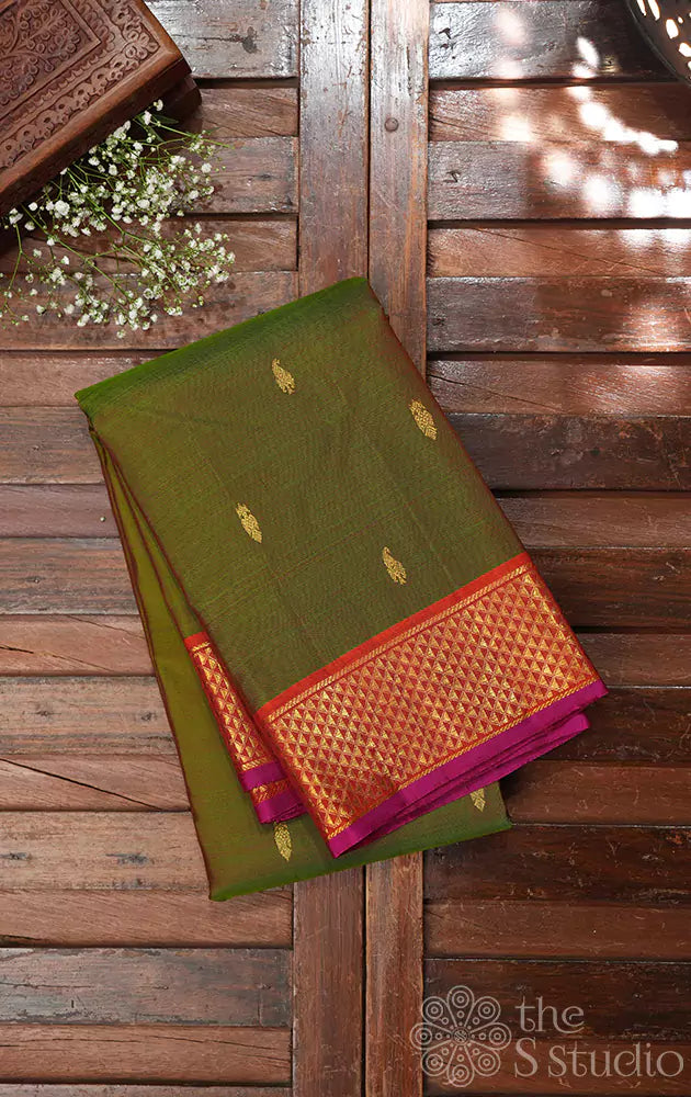 Methi green kanchipuram silk saree with brocade pallu and a border with arai maadam motifs woven in zari