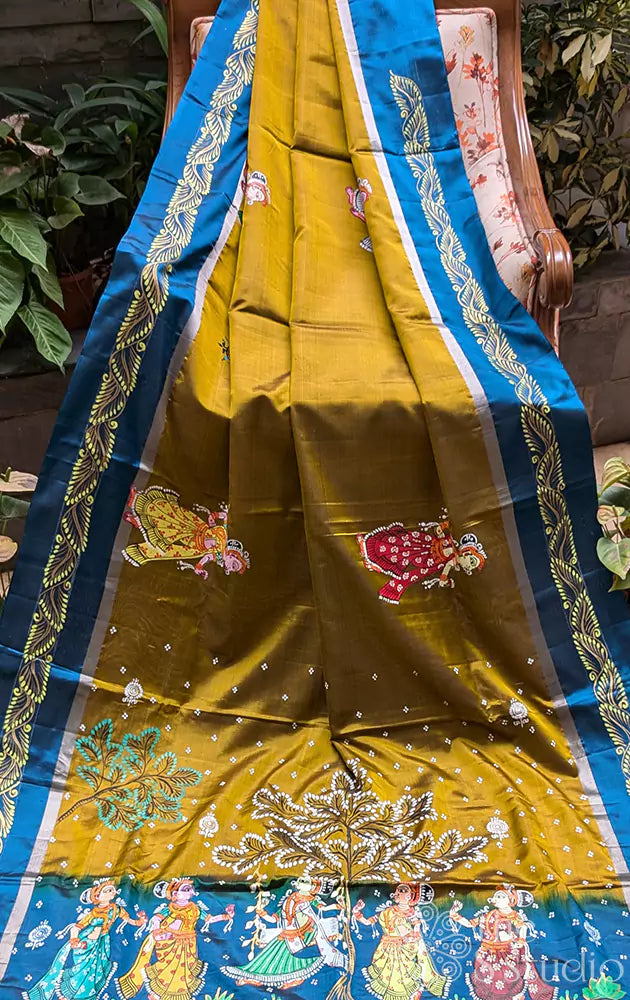 Methi green soft silk saree with hand painted pattachitra art
