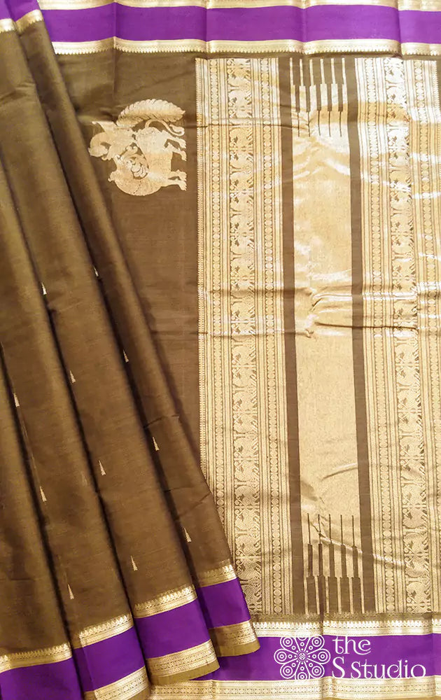 Elevate your saree style in the beautiful tones of our signature Moss Green Kanchi Cotton Saree with an exquisite rich zari border in purple tone. The unique yali motif woven along the pallu makes it a standout design.