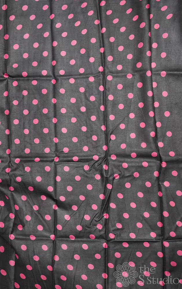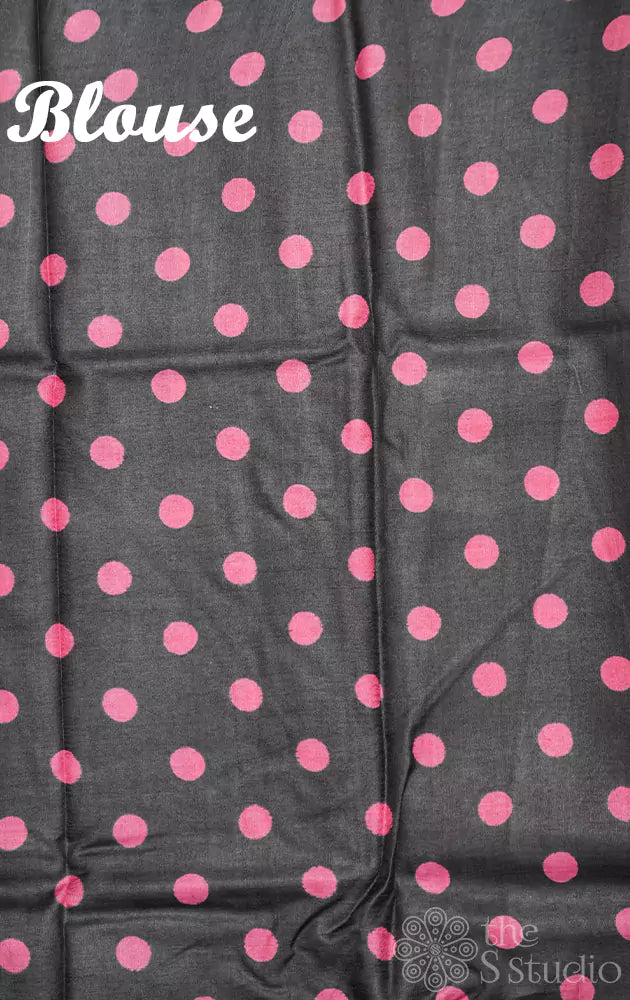 This stunning off white tussar silk saree is adorned with grey, magenta, and pink floral prints on the body. The pallu is beautifully printed on a black base with magenta polka dots all over.