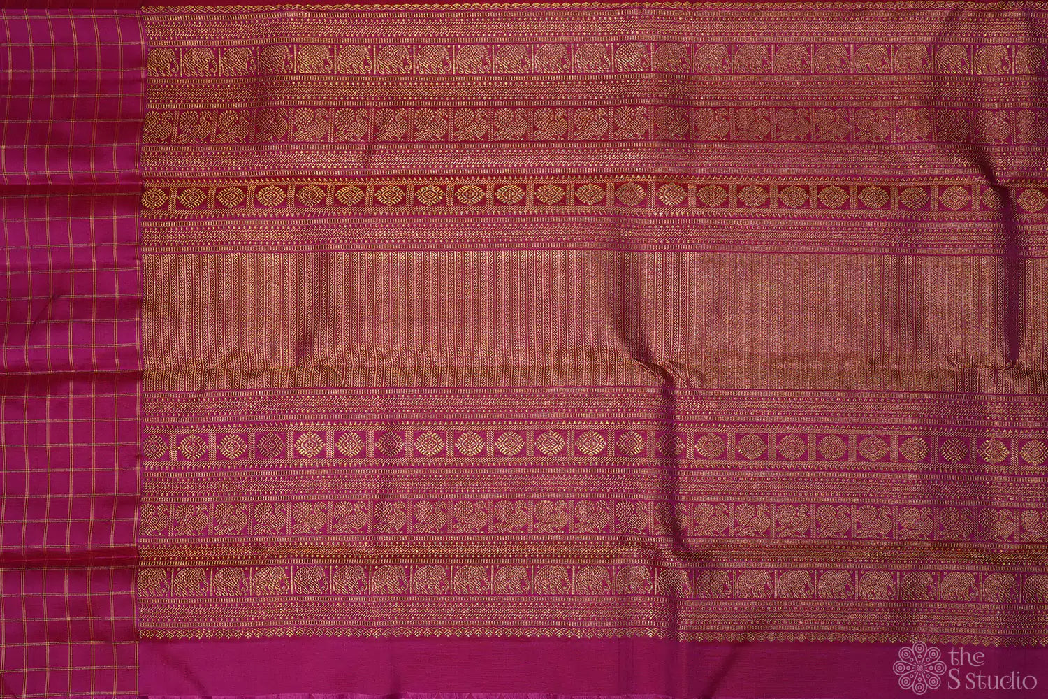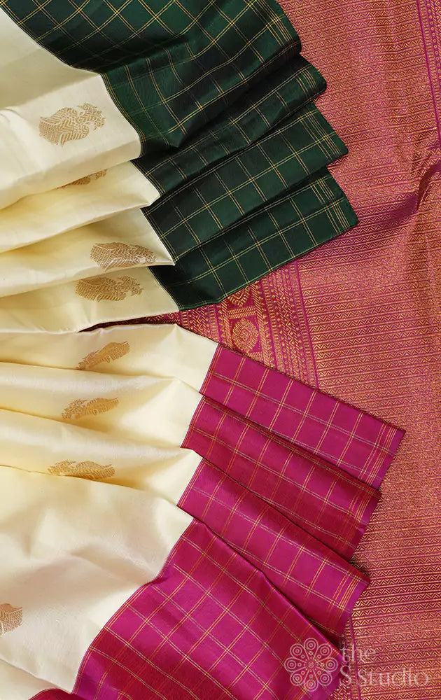Off white Kanchipuram Silk Saree with zari bhuttas handwoven in the body. Unique Ganga Jamuna korvai border in green & pink along with zari check designs highlights the elegance of this saree.