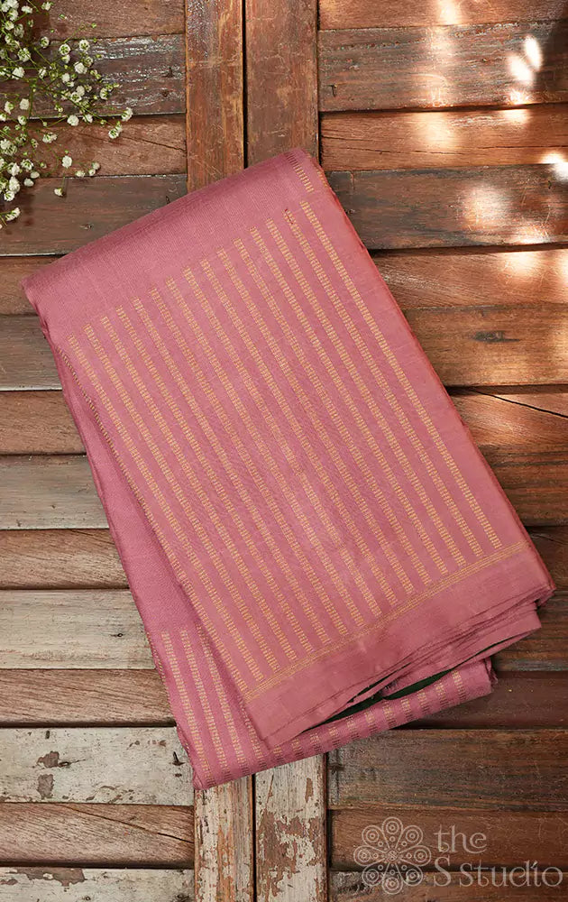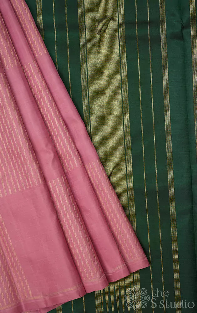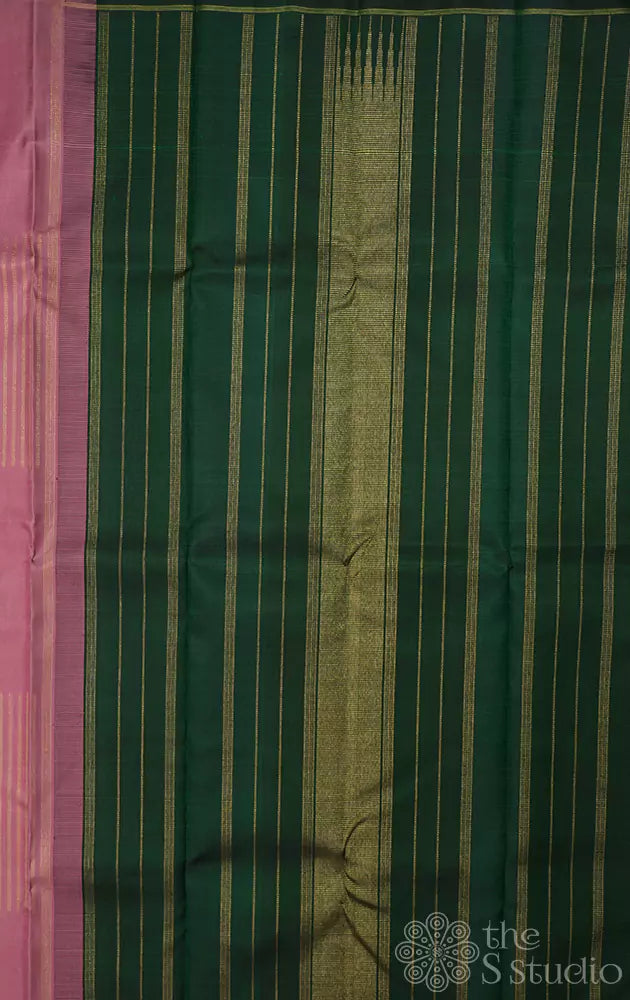 Onion pink kanchipuram silk saree with vertical zari lines in a box pattern on the body. The pallu is a dark green with seer mundhi design.