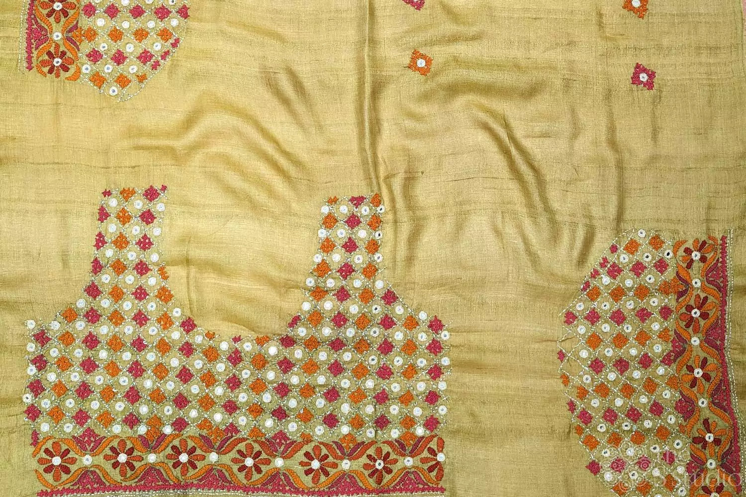 Pale yellow tussar silk material with mirror work kutch hand embroidery