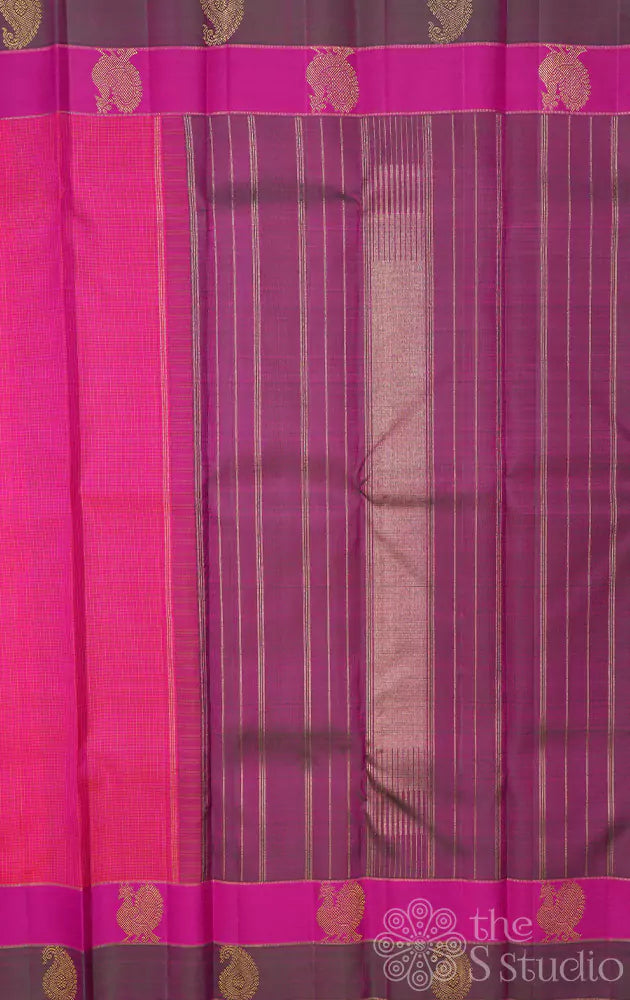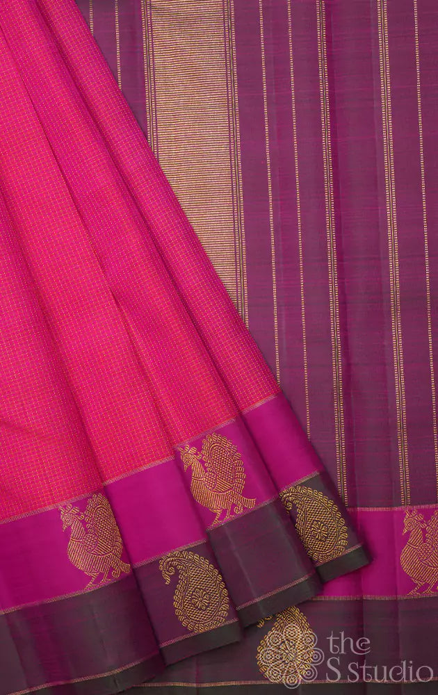 Peachish pink kanchi silk saree with double border woven with annam motifs. The pallu has traditional zari woven.