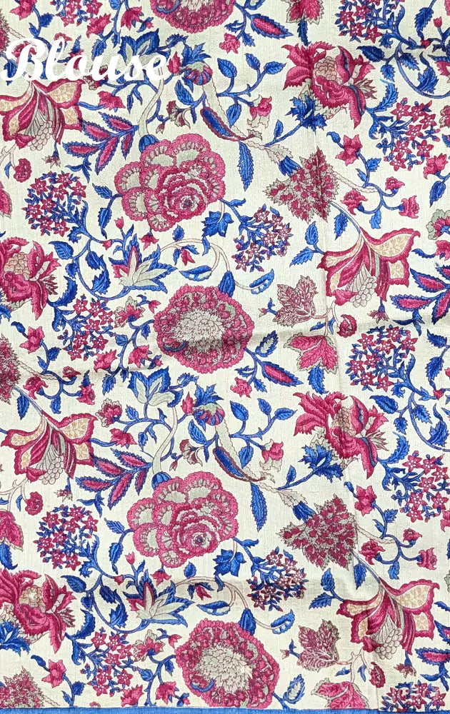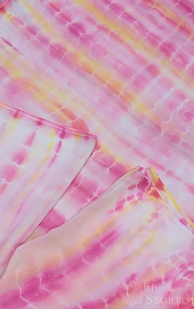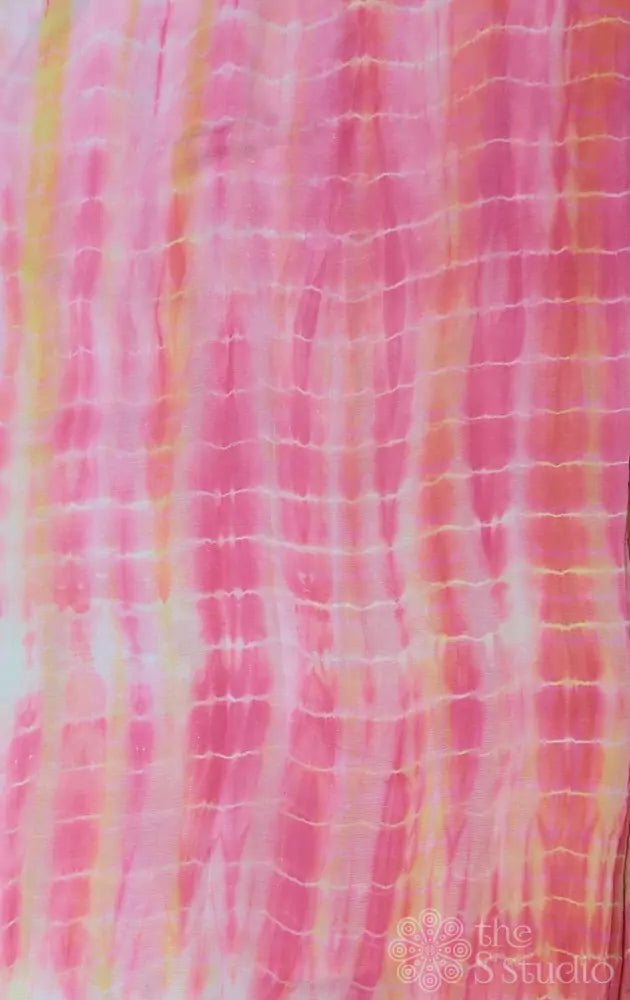 Pink and yellow marble dye chiffon saree comes with white magenta printed raw silk blouse.