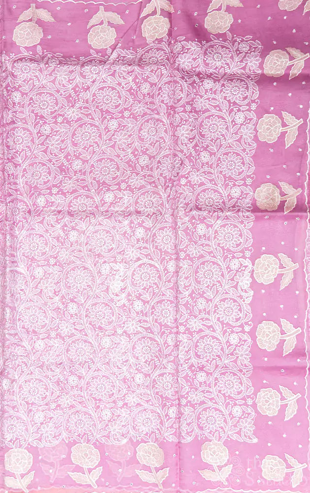 This lavender organza saree is adorned with intricate floral embroidery that spans across its entire body, adding an exquisite touch of craftsmanship and elegance. The border is delicately embellished with charming tiny mirrors along with embroidery, enhancing its look.