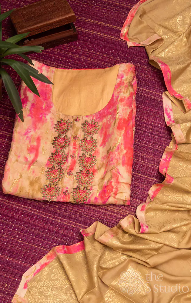 Pink shibori printed chanderi silk salwar set with neck design embroidery and silk dupatta. Material: chanderi silk