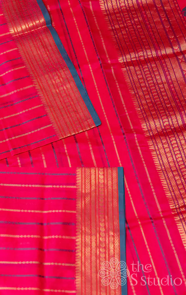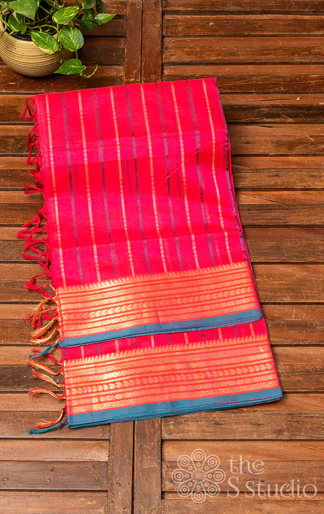 Pink silk cotton saree woven with Vertical lines throughout. The zari border and pallu enhance the look of the saree, which is decorated with traditional motifs.