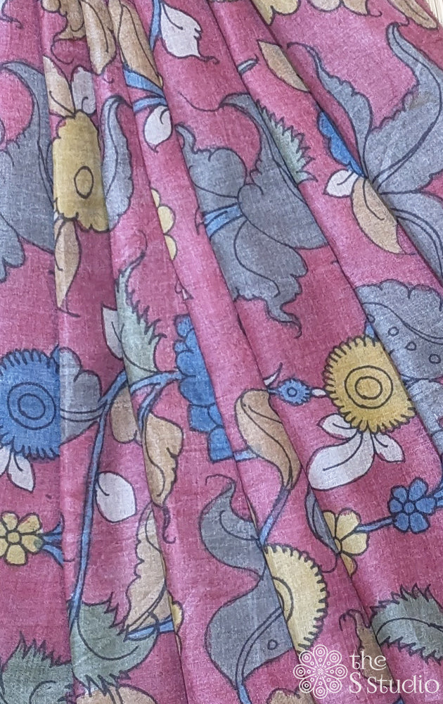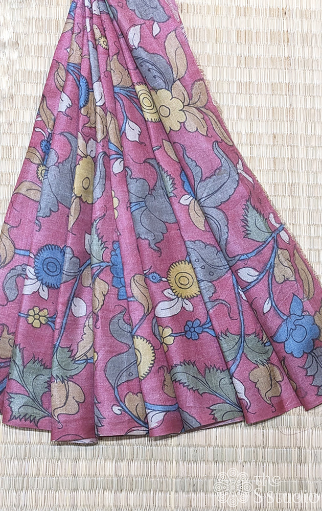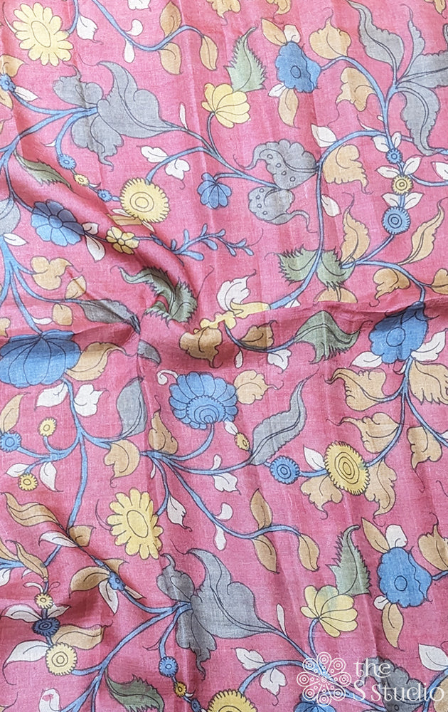 Pink tussar silk with handpainted pen kalamkari work