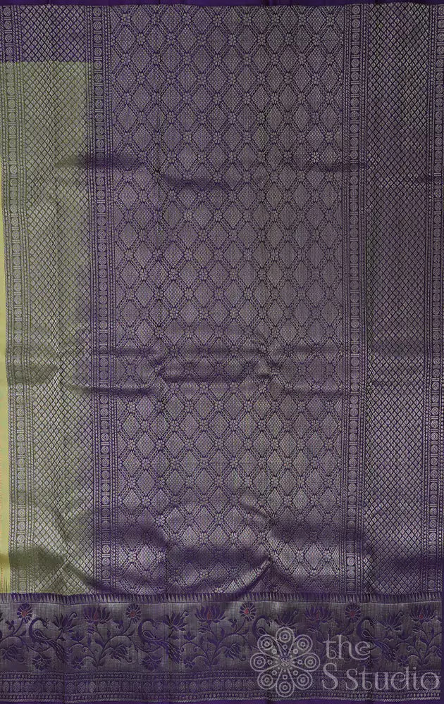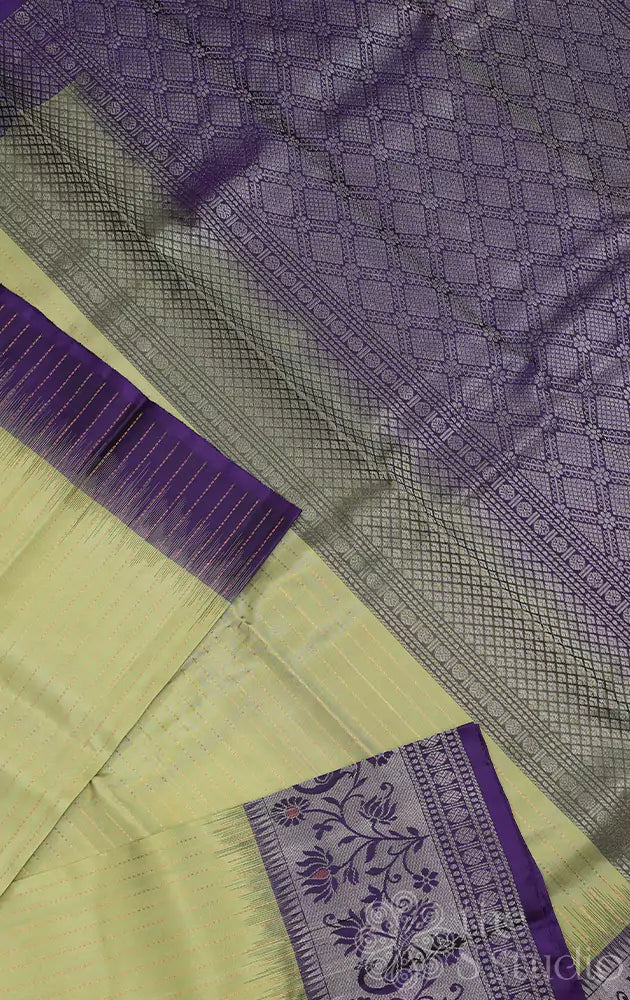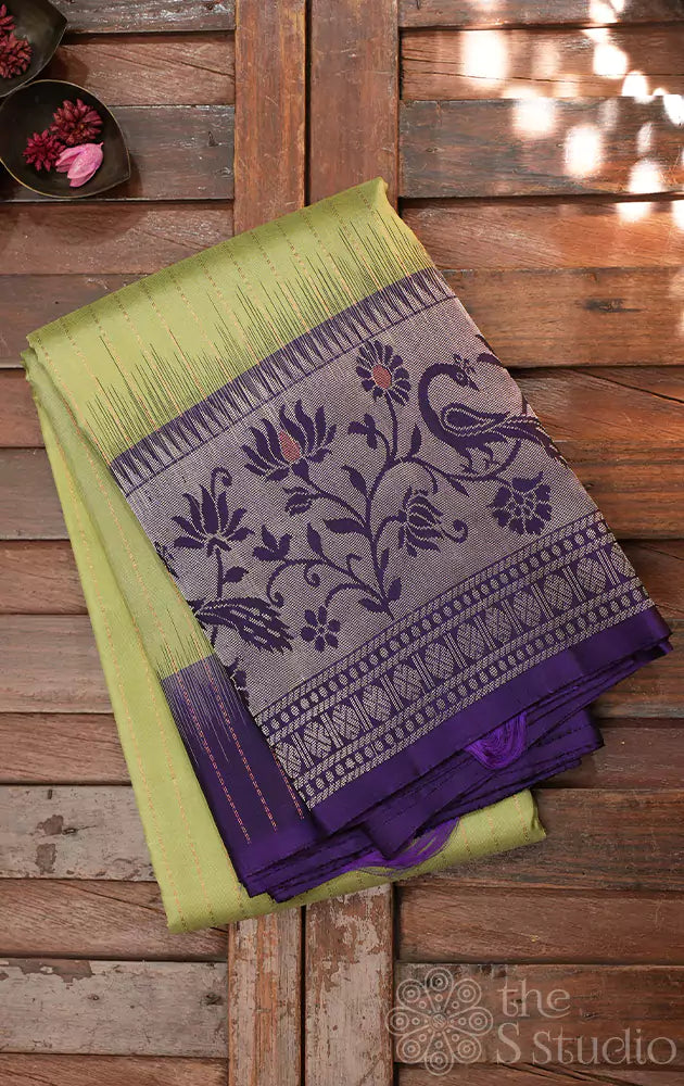 This pista green soft silk saree features elegant vertical lines adorning its body. The saree is beautifully complemented by a contrasting violet pallu and a stunning Paithani style zari-woven border, adding a touch of tradition and sophistication.