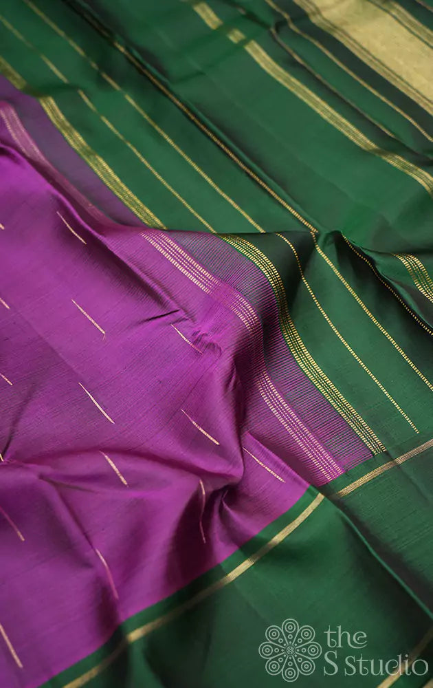 Purple kanchi silk saree with mazhai thuli (rain drops) motifs in pure zari woven all over the saree. A green rettai pet border is a classic contrast to this saree with a simple seer mundhi pallu.