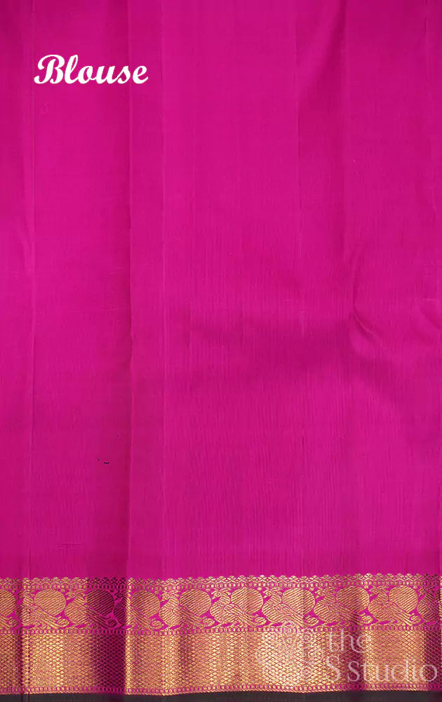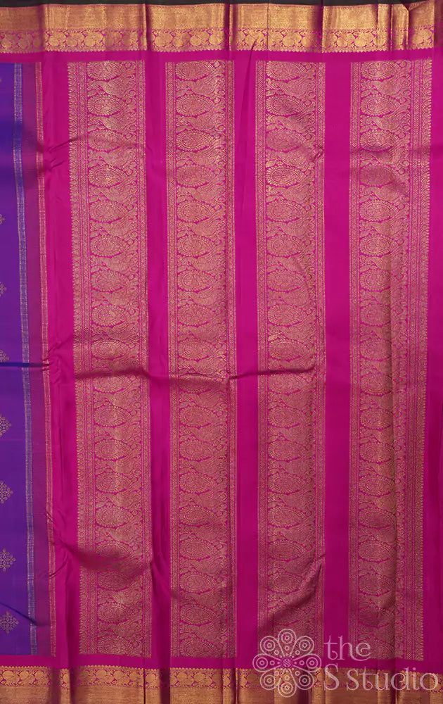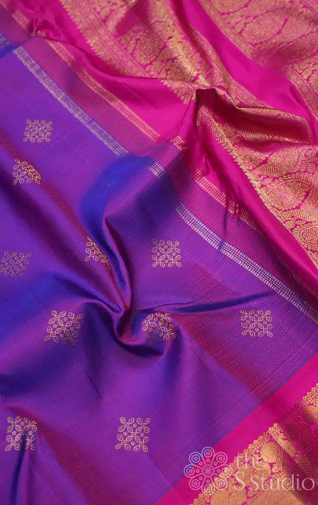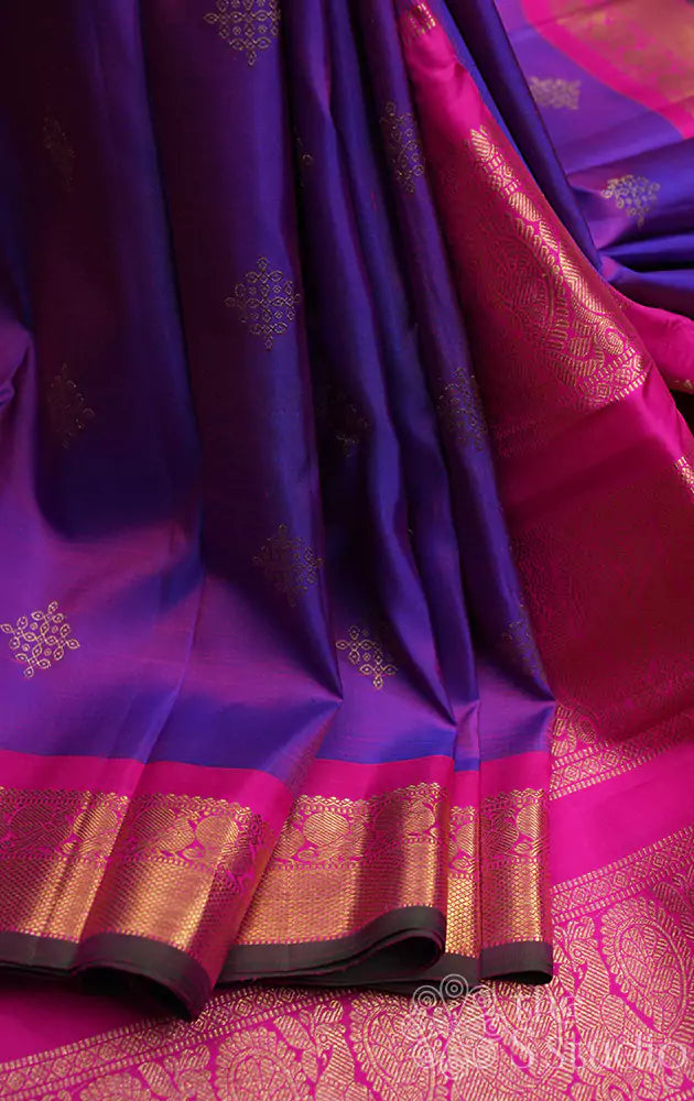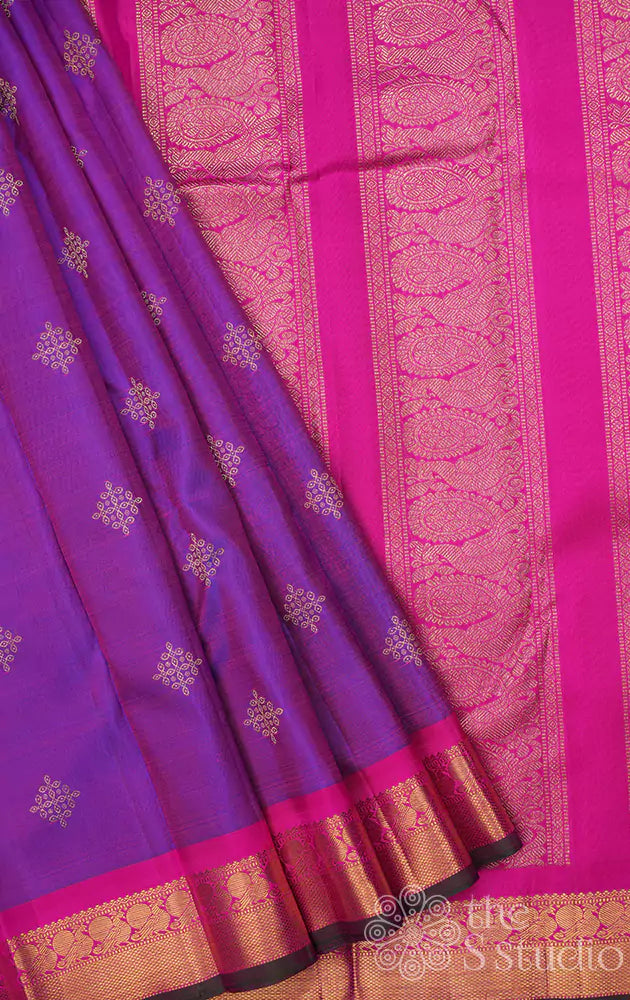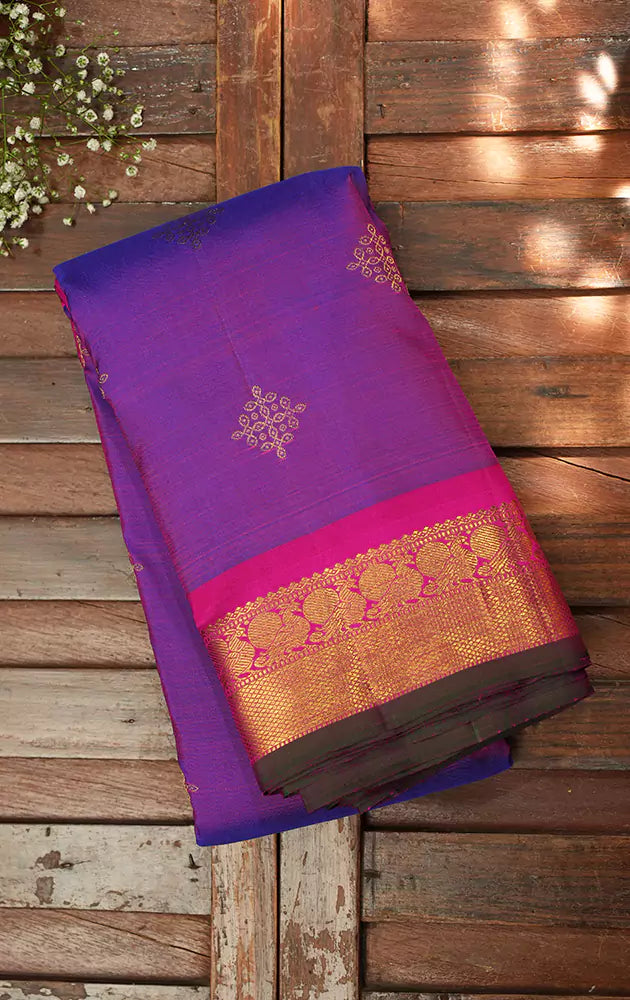 A pure zari Purple ten yards kanchi silk saree for madisar saree draping. The saree has rich kolam motifs and the border and pallu are woven with bands of intricate kanchi designs like annam which makes it a clasiic choice for a bride for her muhurtham saree.