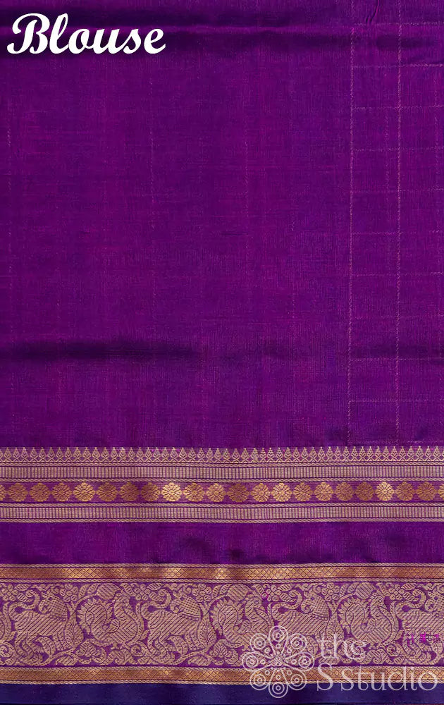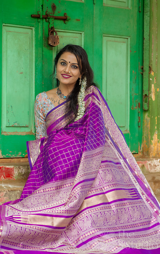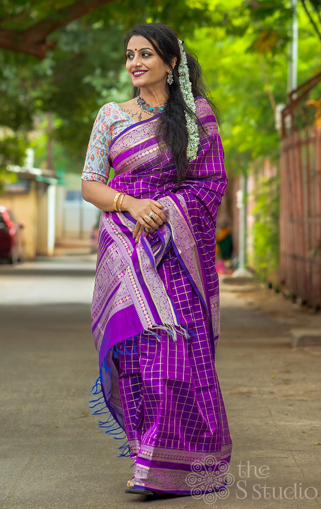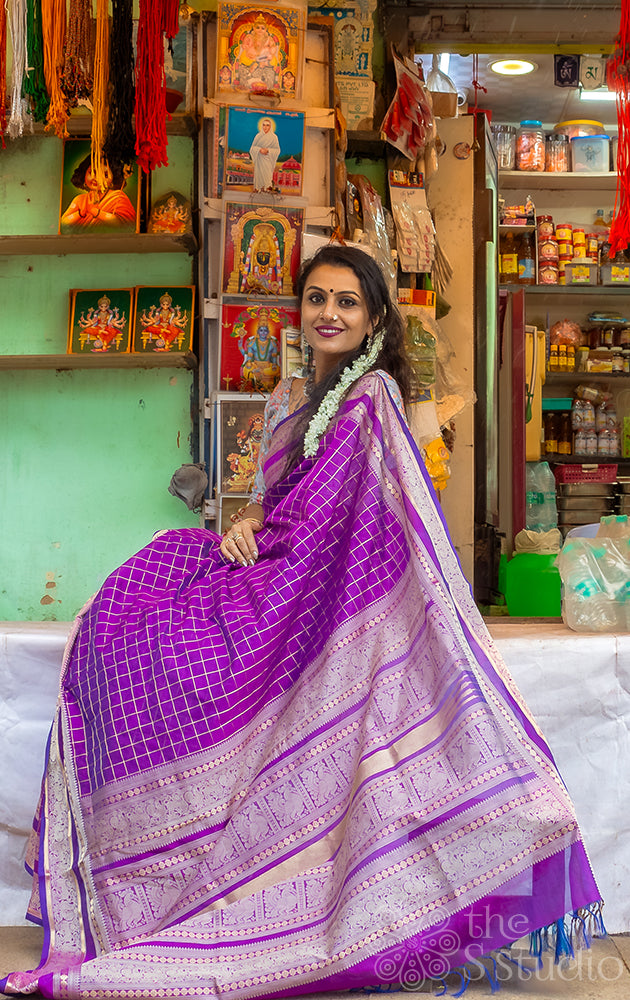 Purple zari-checked silk cotton saree adorned with annam and gaja yali motifs woven in thread on the border and pallu of the saree. The threadwork designs are outlined with kamalam zari buttas.