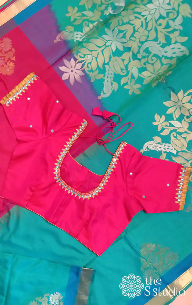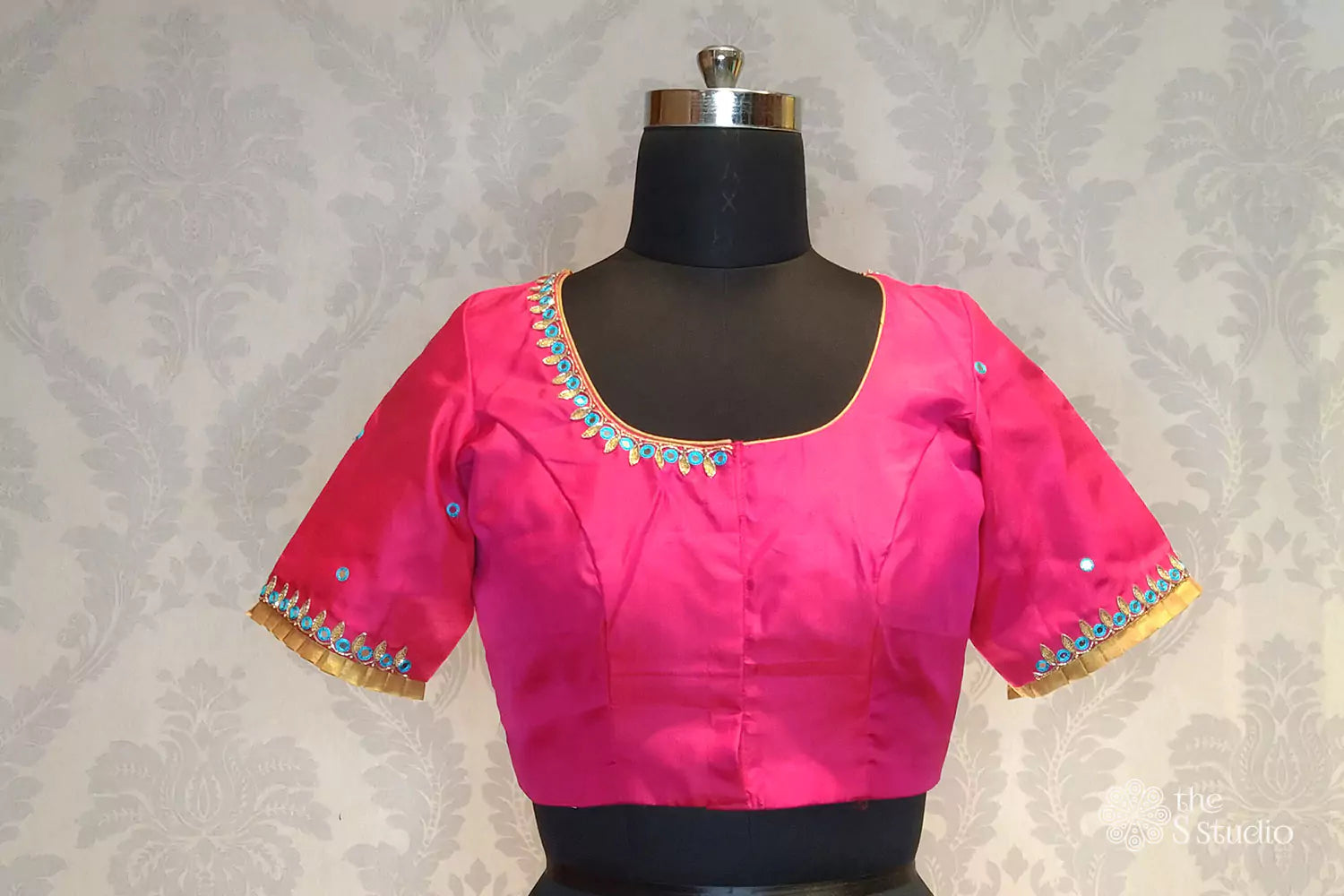 Rani pink Kanchi silk readymade blouse with hand embroidery for neck and sleeves. Includes: Regular sleeves, front open and tie back Note: All readymade blouses have margins inside and they can be made one size smaller or bigger.
